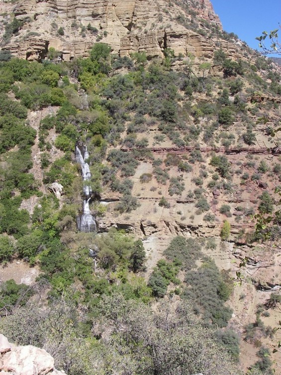 The sound of water rushing out of the springs at the base of Roaring Springs cliffs grew louder as we approached. Pictured below, Roaring Springs is the source of water for both North and South Rim. We passed a pump-house soon before the trail turns South into Bright Angel Canyon.