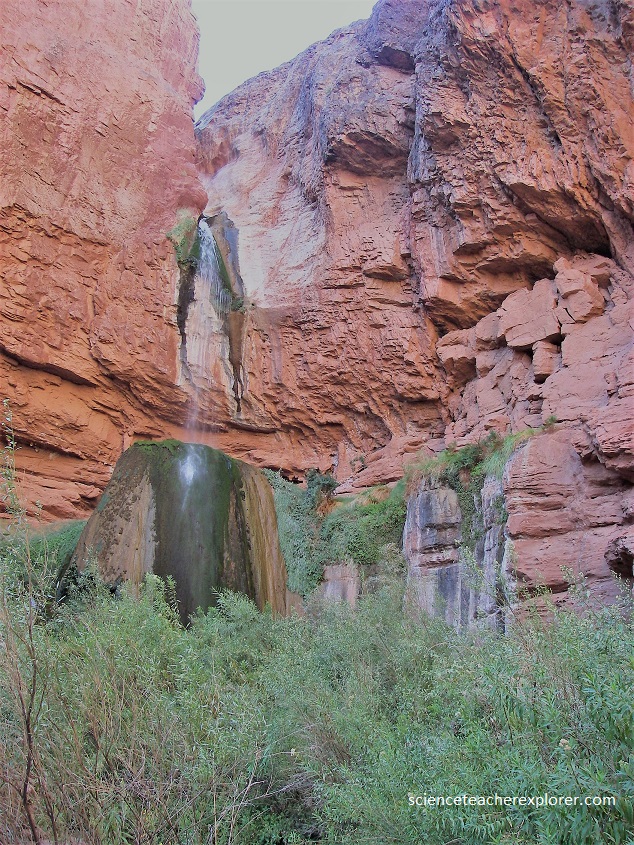 Above the Ribbon Falls, the rock is part of the Tapeats Sandstone. The Tapeats Sandstone layer averages about 545 million years old and is composed of medium-grained and coarse-grained sandstone. Ripple marks formed by ocean waves of an early Cambrian sea are common in the upper part of the layer. The Tapeats is similar to the Redwall in that it forms a barrier between upper and lower reaches of the Canyon that can only be traversed where a fault has caused its collapse. The color of this layer is dark brown, (pictured above). These falls are found at the bottom of the Tapeats Sandstone and at the “Great Unconformity”. This non-layer indicates an age in which no sediments can be found. It is indicative of a time when an advancing sea eroded away the sediments that should be here.