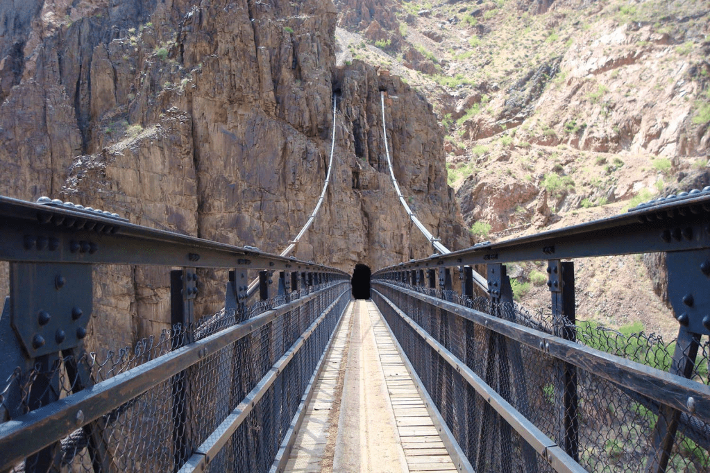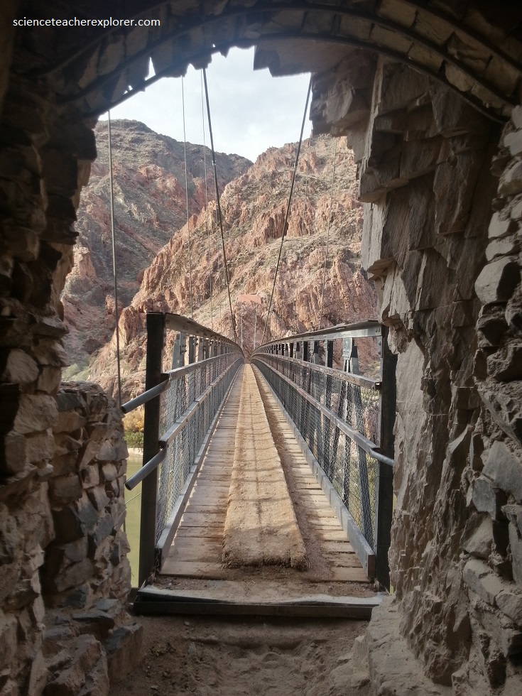 At the river, (late in the evening), we crossed the Kaibab Suspension Bridge, one of only two bridges across the Grand Canyon. This part of the trail was used primarily by mule trains taking supplies and guests to Phantom Ranch. Most other trekkers took the longer, less steep Bright-Angel Trail.
