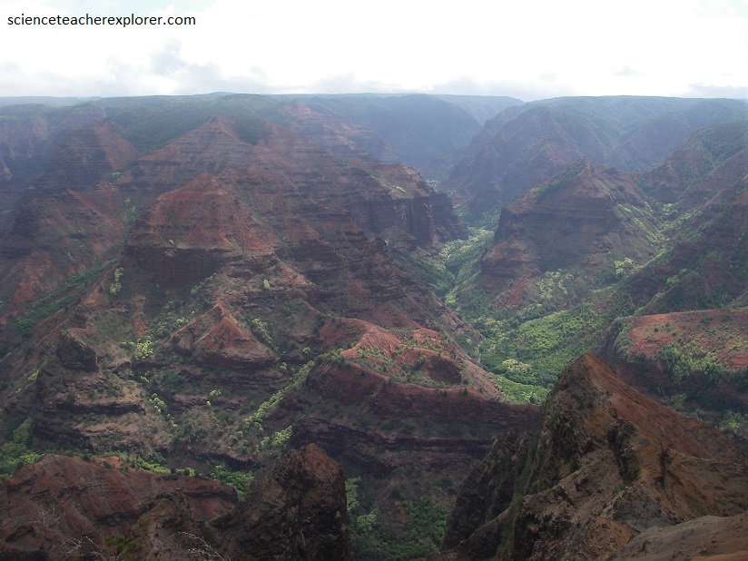 Waimea canyon is situated on the western portion of Kaua’i Island and protected within the boundaries of Koke’e State Park. As mentioned above, it was once part of an ancient volcano, but part of its flank collapsed thus enabling the Waimea River to cut through a weakness in teh layers of volcanic rock.