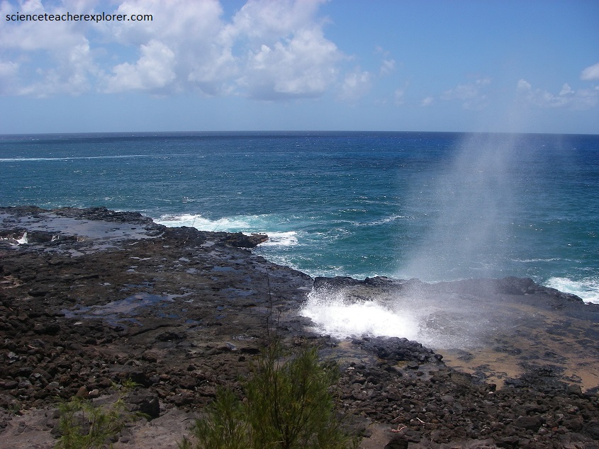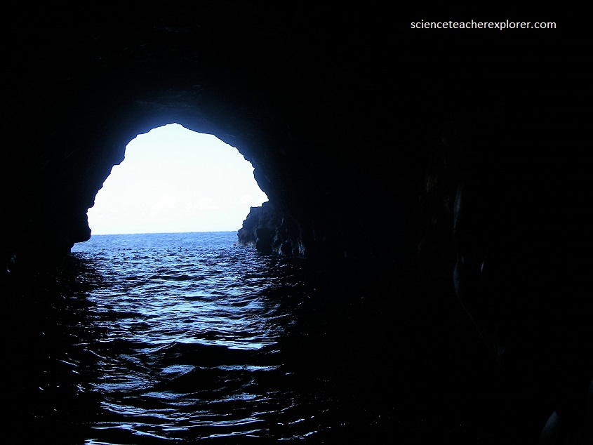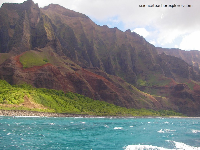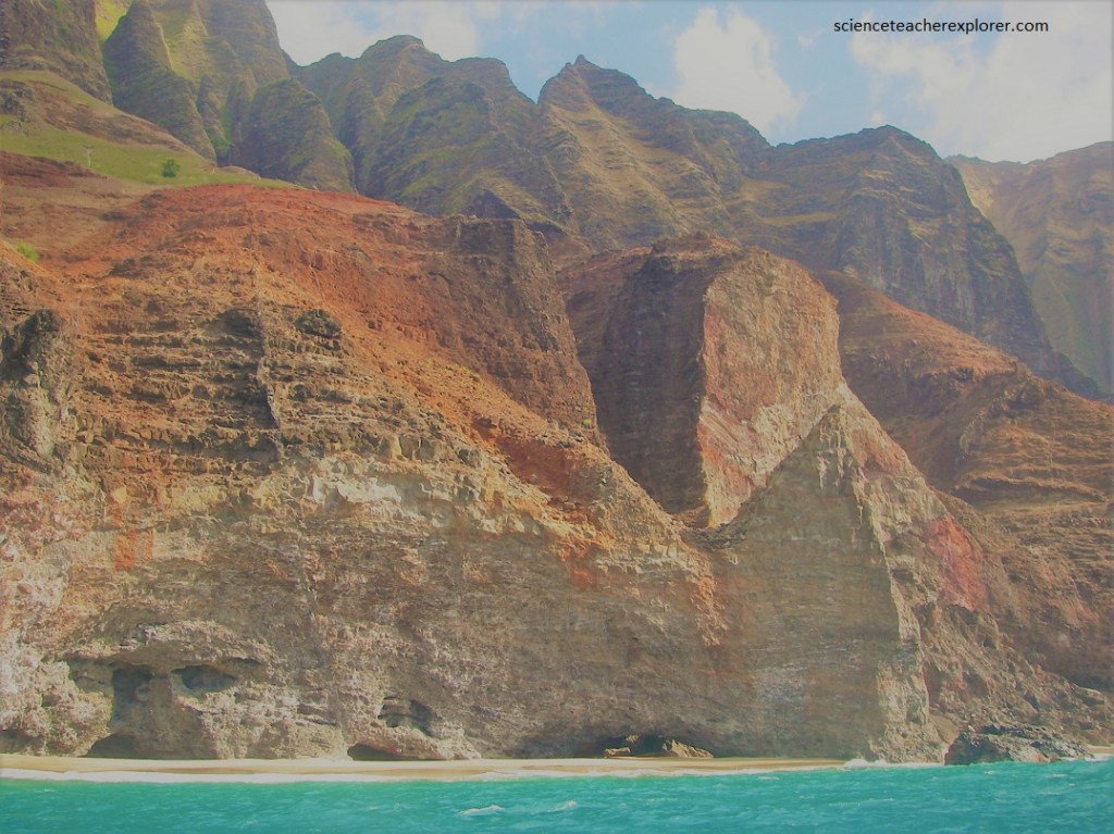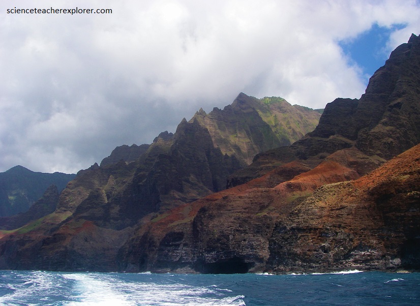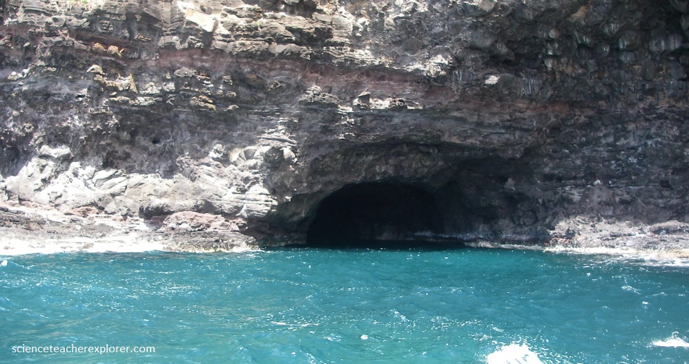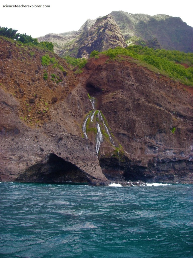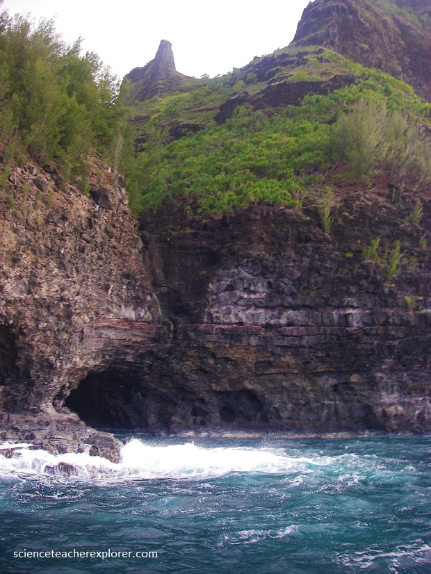 The sea caves along the Na’ Pali were formed when the waves cut through the rock, (pictured below).