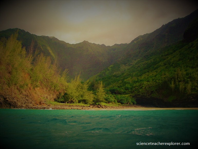 5 million years ago a massive amount of water was spilling onto the northwest side of the island, carving out the valleys of the Na’ Pali Coast. Not only were streams cutting down from within, giant waves up to 15 m high continuously battered the Na’ Pali Coast, and still do today.
