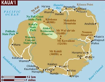 The Na’ Pali Coast stretches 27.4 Km from Ke’e Beach on the north shore to Polihale State Beach Park on the west shore, with cliffs reaching heights up to 1,400 m (pictured below).