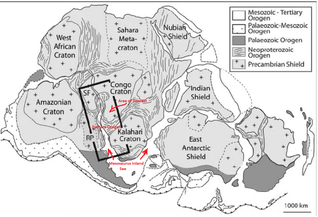 The Mesosaurus Inland Sea formed on the Gondwana continent between what is today the split up of the Congo Craton in the north, the Kalahari Craton in the south, South America and Antarctica. This sea was most probably entirely enclosed or in contact with the world ocean, Panthalassa, through only a few, narrow seaways. If the water of the Mesosaurus Inland Sea was initially saline, it gradually turned brackish before becoming fresh, thanks to the river systems flowing into the restricted basin. {This sea is named after the small swimming vertebrate, ‘Mesosaurus’, that inhabited it for a short time in the early Permian, and existed nowhere else on Earth.