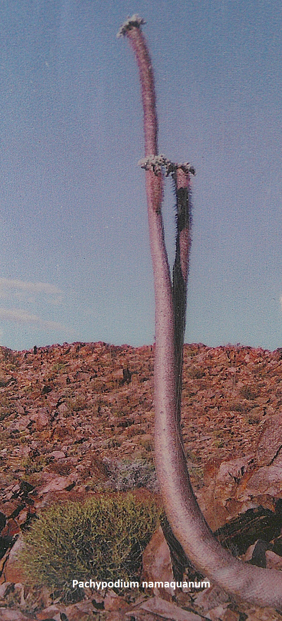 Pictured above, the Fish River Canyon area has a typical semi-desert climate. The average annual rainfall in the canyon area is 100mm. It drops vertically by half a kilometer, out of a flat arid plateau without any warning here. As with most rivers in Namibia the Fish River is generally dry however in the raining season (January to April) the river can become a raging torrent. The park is characterized by two biomes: the Nama Karoo and the Succulent Karoo. The Nam Karoo, located east of the Fish River, is dominated by grassy dwarf shrubland, (pictured above). The Succulent Karoo, west of the river, is of course characterized by succulents. Some of the succulent species for which the park is famous are worthy of individual mention: the iconic quiver tree (Aloe dichotoma) and the “halfmans” (Pachypodium namaquanum or “elephant trunk”) are two of the largest mega-succulents. The Hoodia gordonii is now extremely threatened because it contains the appetite-suppressing molecule P57. The Hoodia gordonii is a leafless, spiny succulent plant that has flowers that smell like rotten meat and are pollinated mainly by flies, (pictured below). {Pictures below were taken from an interpretive sign}.