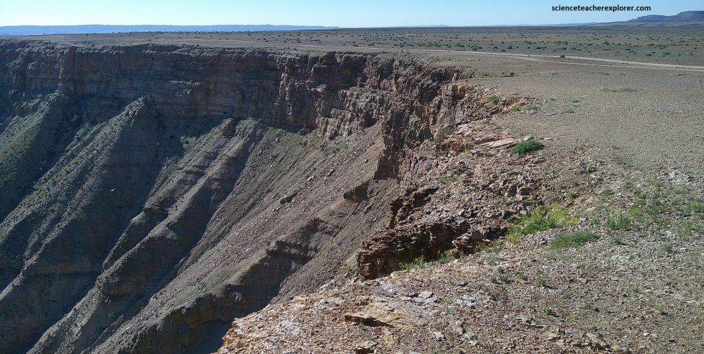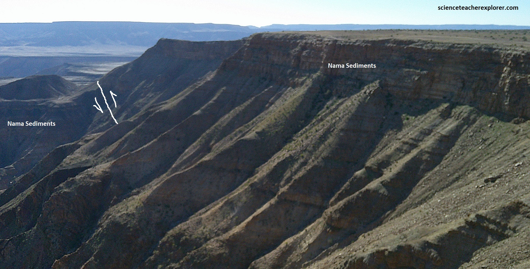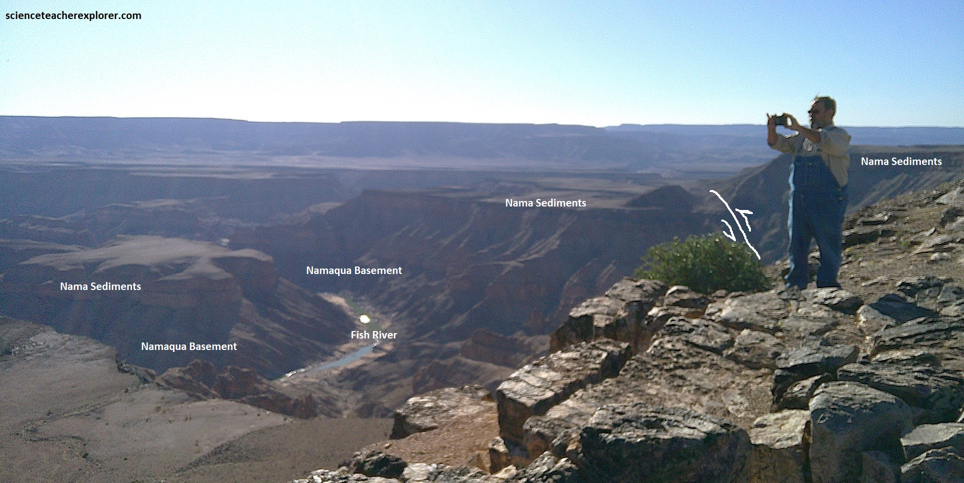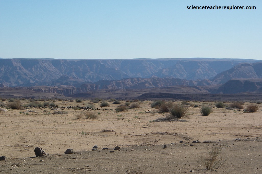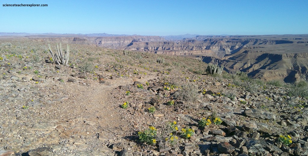The upper part of Fish River Canyon is actually born of a tectonic event, (not erosion): a huge block of the Earth’s crust subsided along deep-reaching faults, forming a so-called “graben” (trench). One of these faults is clearly visible in the picture with my trekking buddy, (Tracy Davis). {This fault creates an easy axis off the rim into the river below–Hiker’s Point}. It is only at this point that erosion took over in the creation of the canyon. The hard quartzite of the Nama Group prevented the river from easily cutting into the depths, forcing it to cut sideways instead. A leveled plain wa thus created: today’s upper canyon. (The photos below are looking northwest from the rim of the Main Viewpoint).