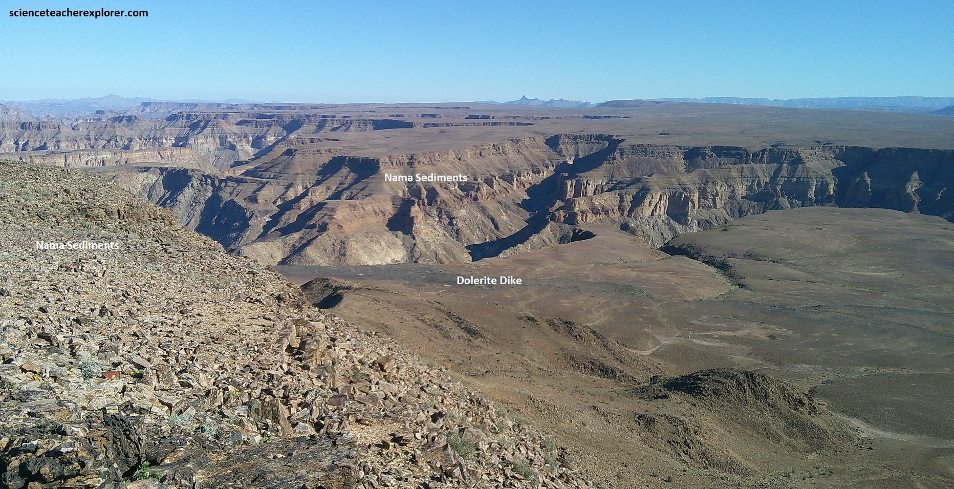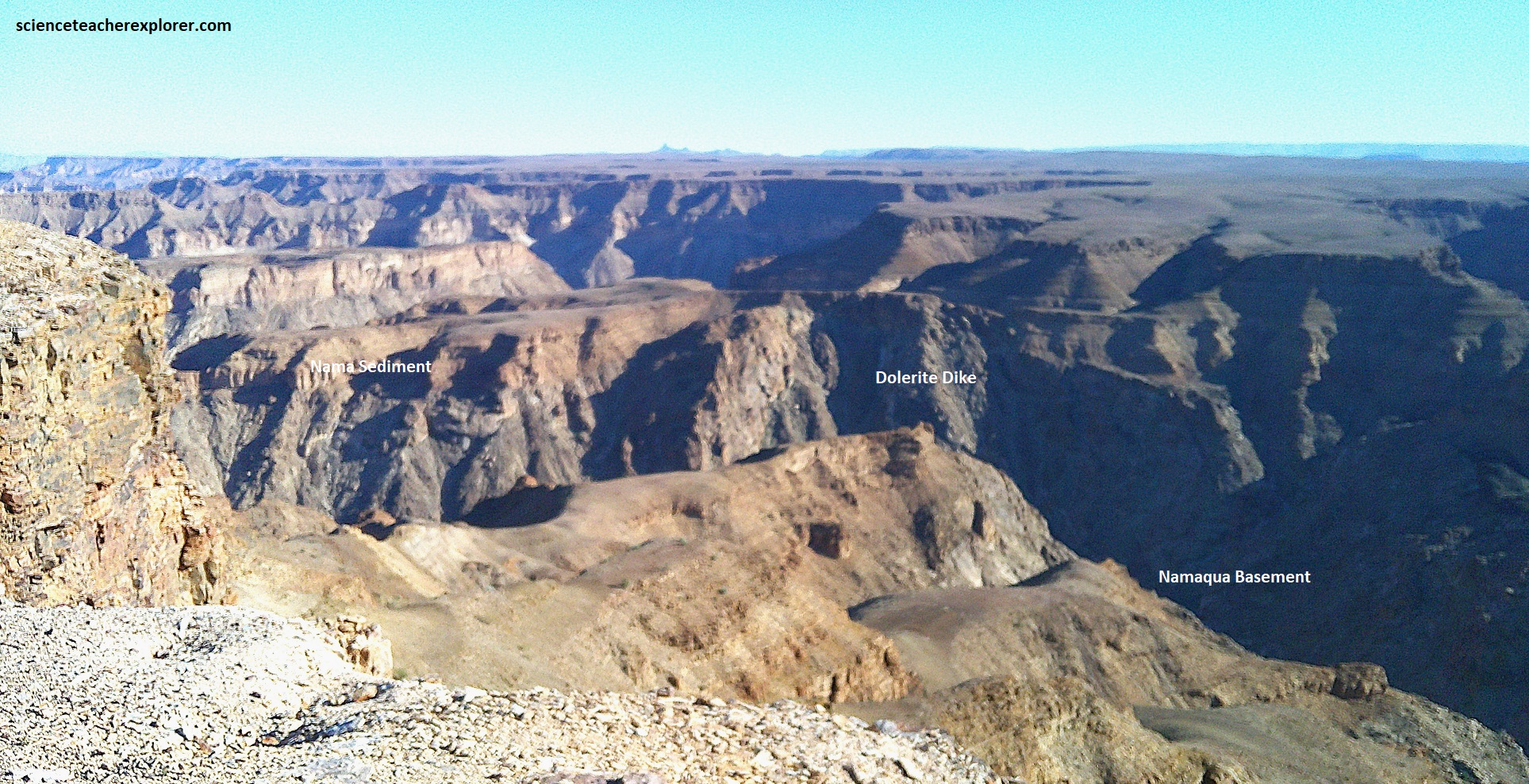 Dikes of dolerite (a volcanic rock cooled below ground), ranged in a north-south directions, up to 100km long and 1.5km wide, are witness to a volcanic episode about 800 million years ago. These structures can be seen to extend south far beyond the Orange River into the Richtersveld. They are also visible in the photos below with the Fish River Canyon. (Photos below are looking southwest from the Main Viewpoint of Fish River Canyon).