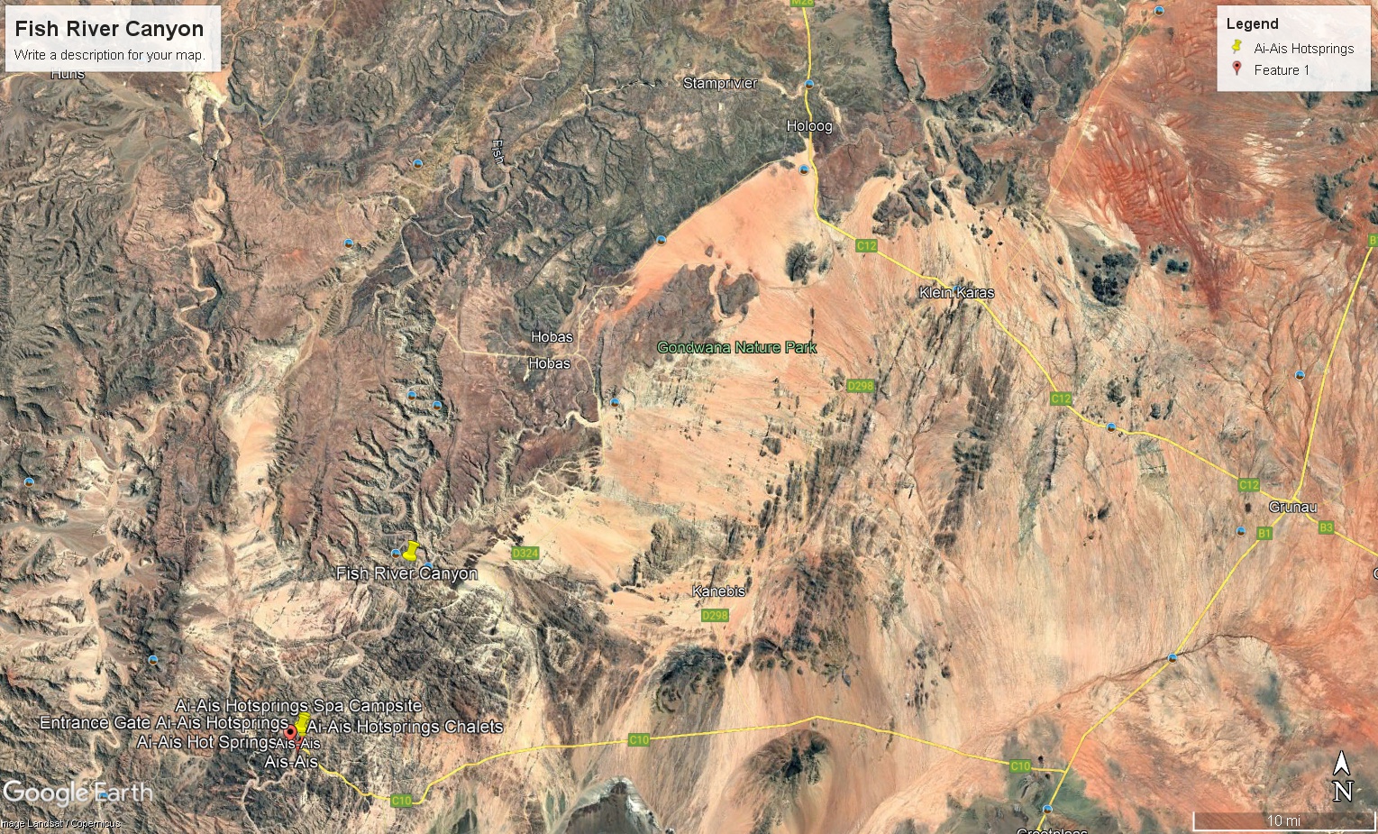 Our next point-of-interest and geo-site to explore was the ‘Fish River Canyon’. The ‘Fish River Canyon’ is without doubt one of the most impressive geological features of Africa. The Fish River flows more than 650km across the Namibian plateau from its source east of the Naukluft Mountains to its confluence with the Orange River at the border with South Africa. From about 100km south of the town of Seeheim, flowing south to Ai-Ais, the Fish River has carved a gorge of itself in the Namibian plateau, cutting down as deep as 550m and as wide as 27km in places over a stretch of some 90km. We decided to start our exploration of the Fish River Canyon by driving to and visiting Ai-Ais.