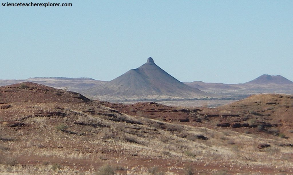 Dolerite is a black grey dike rock that has the same chemical composition of basalt. However, it solidifies below the surface and is a coarser, (bigger crystals), of which is only exposed by weathering processes. Dolerites mostly occur as single dikes. If, however, they crosscut the surrounding rocks in large numbers they are called dolerite swarms, (common in Namibia).