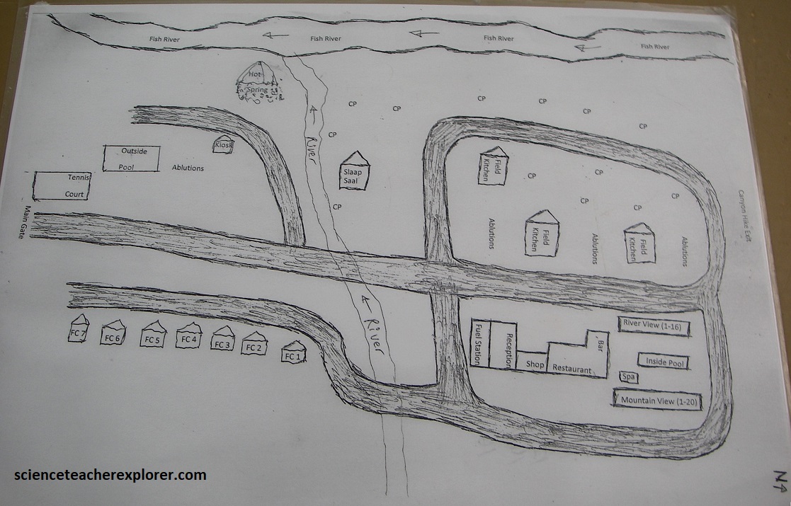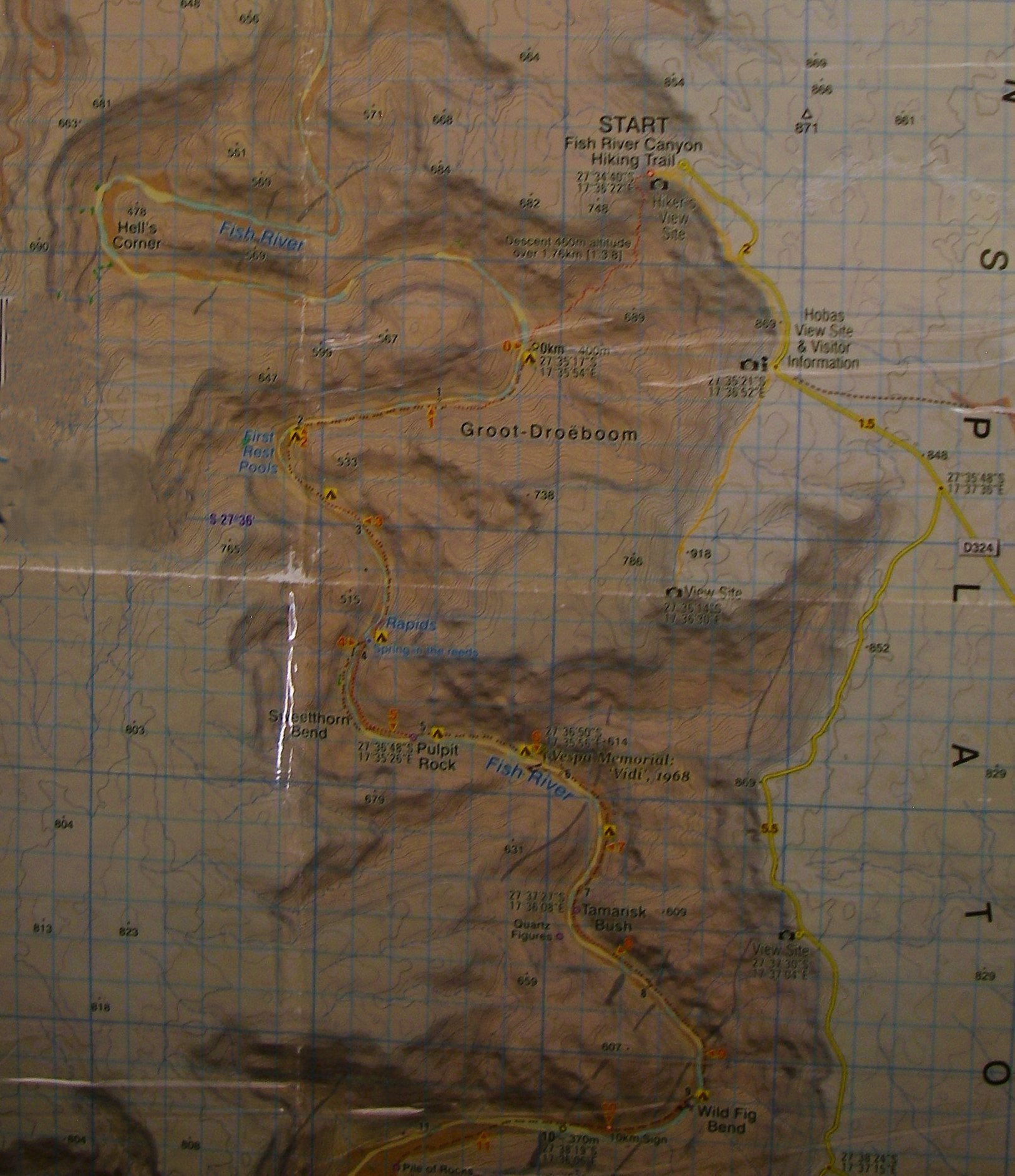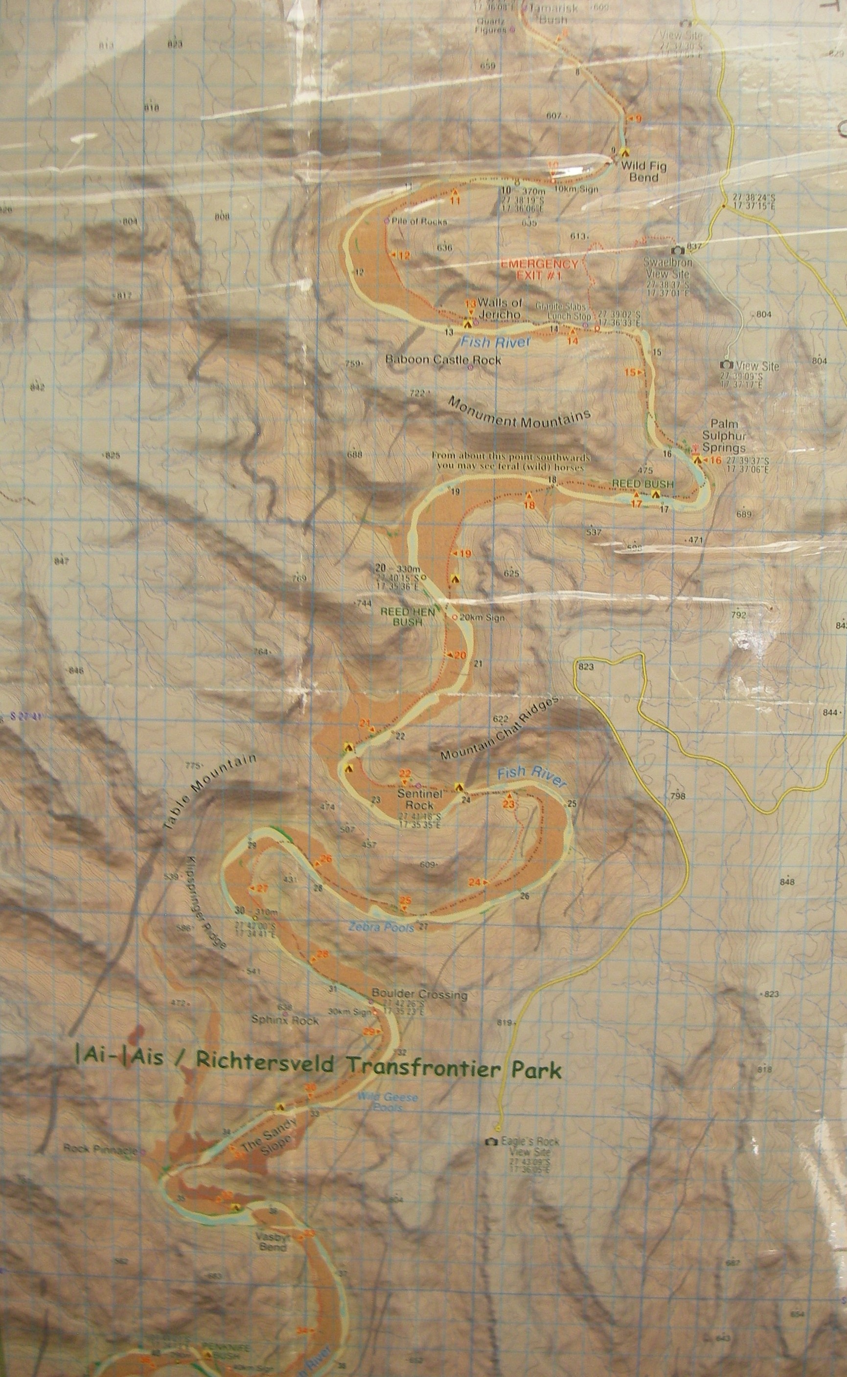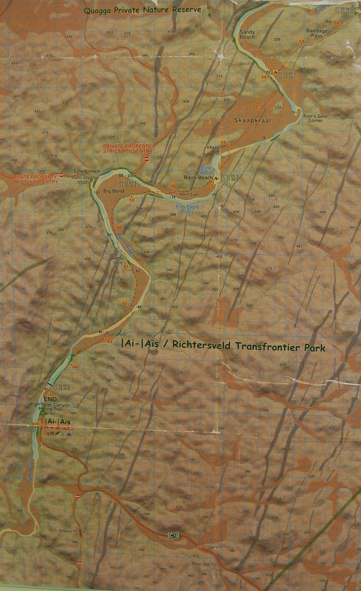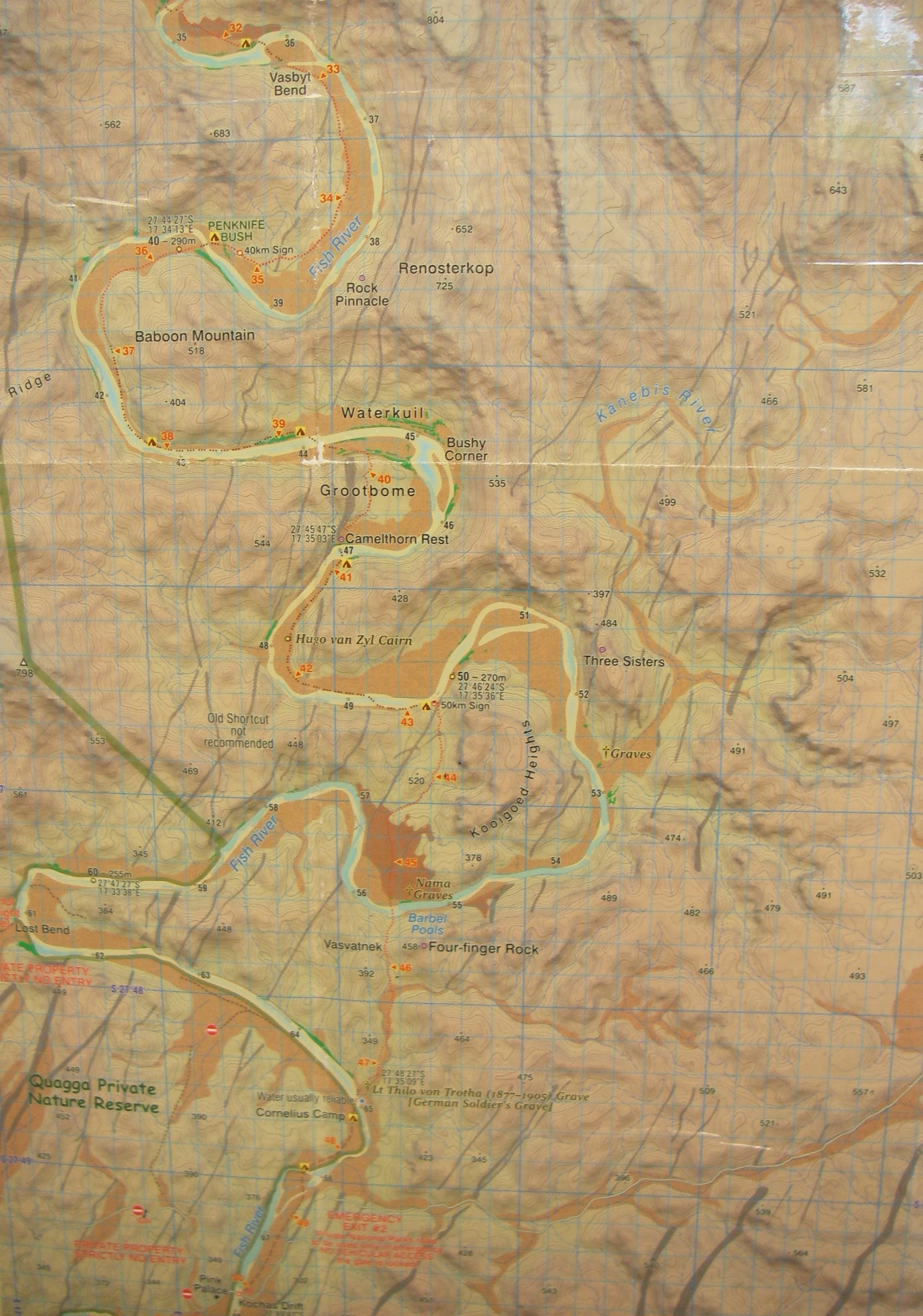 The Fish River flows intermittently, usually flooding in late summer and when it ceases to flow it becomes a chain of long narrow pools on the sandy rock-strewn floor of the chasm where hikers can enjoy the refreshing pools as they hike the famous Fish River Canyon Trek. This trek requires good physical health and should only be undertaken during the cooler winter months (between May and September). A permit must be obtained & the trek is 86 km in length, which takes about 5 days. It starts at the Hobas Camp on the north end of the Fish River Canyon, and ends at Ai-Ais Resort & Spa where there are rooms, chalets and camping available. There is actually a shuttle at the Ai-Ais resort that transports you to the start of the trek, and then allows you to park your vehicle at the end, (Ai-Ais) during the 5 day trek. {Note: The images below are the trekking-maps provided & posted on a interpretive sign at Ai-Ais}. Personally, we didn’t have time to accomplish this adventure.