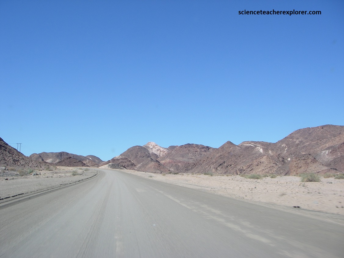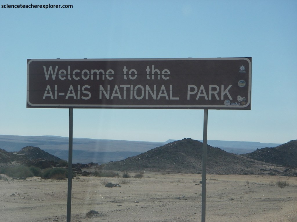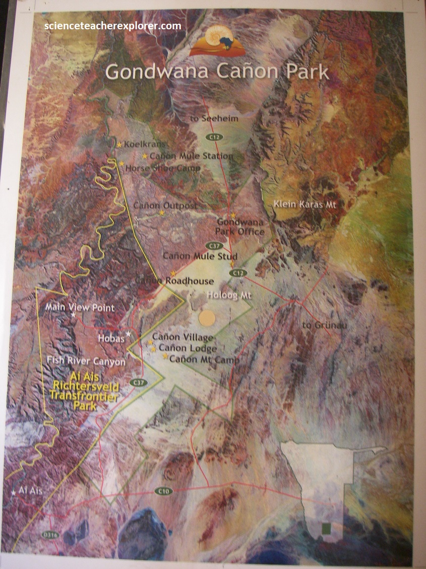 The Fish River Basin cover an extensive area of southern Namibia, draining an area of about 120,000km2. Because it comprises rocks formed during most of the major rock-forming periods known in Namibia, there is much variety among the rock types, fossils, and mineral deposits found here; and the landforms of the basin reflect this variety, as well as the long geomorphological history of the area. Tracy and I drove up to the starting point of the Fish Canyon Trek, and looked over the edge of Hell’s Bend. To do this, we drove back out of Ai-Ais Park on C10 and turned left, (north), on D324 to the Fish River Overlook road at Hobas Camp or Hiker’s Point. This was about 80km or 1.25hrs long. Below are photos I took along the way, looking towards the Fish River Canyon, along with a map of the Ai-Ais & Richtersveld Transfrontier-Park posted on an interpretive sign at the Ai-Ais Resort & Spa .