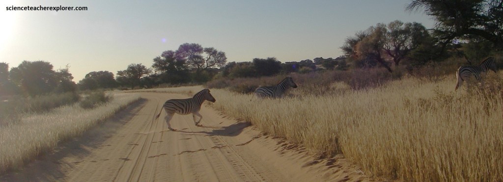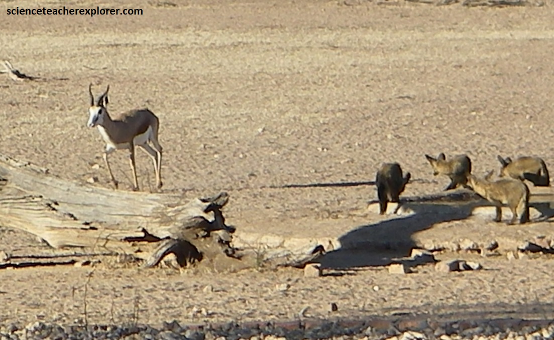 While exploring the Kalahari Game Preserve at the Namibian/South African border, we viewed a small water-hole being shared by a den of ‘Bateared Foxes’ and a springbok. These ‘Bateared Foxes’ were small, bushy-tailed foxes with enormous ears, grizzled grey coats and short black legs. Their face was masked in black and the forehead was white. I understand that they are usually active at twilight and after dark, but we were there during their winter and they were out during the day. Apparently, they live in groups of 3-7 consisting of a monogamous pair and their offspring nearby.