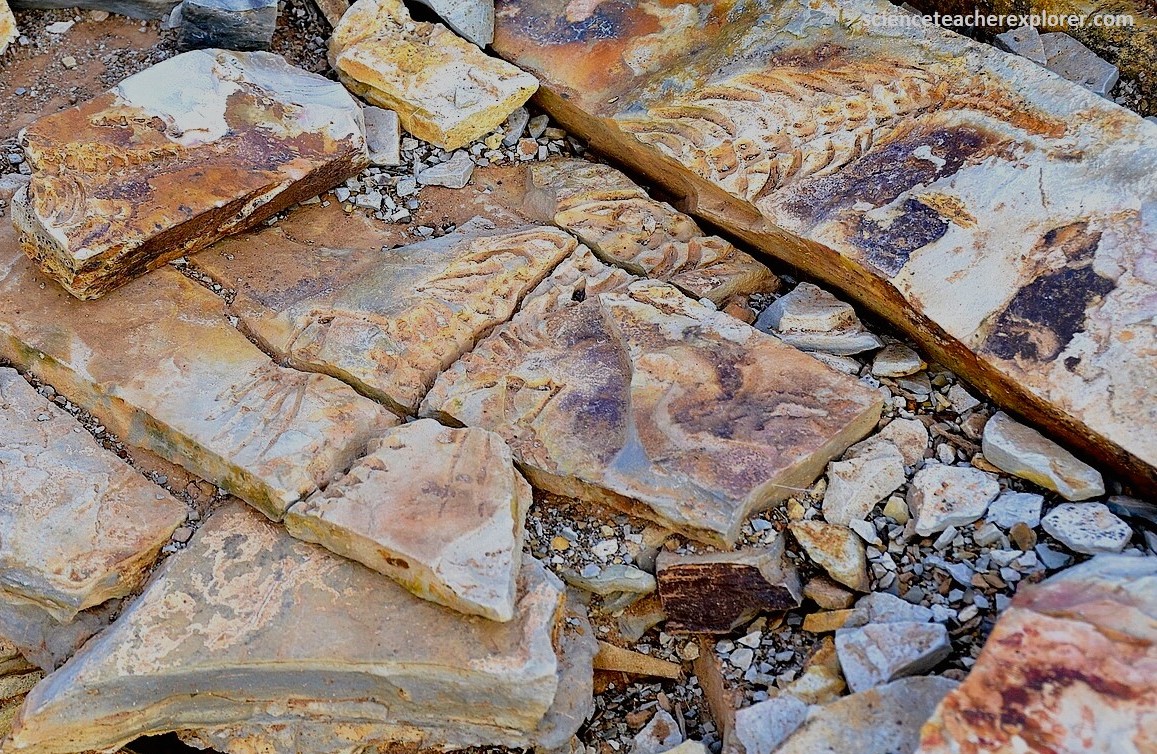 Pictured above and below, the Mesosaurus Fossil Camp owners Giel and Hendrik Steenkamp takes visitors to explore their fossil wonderland. However, Tracy and I missed the opportunity for this, because we got there at mid-day. Apparently, they’re tours were only done in the early mornings & late evenings, (at twilight). So, we helped ourselves with the photos below. {These fossils were found within the Whitehill Formation, (Early Permian period), a grey, hard, dolomite-bearing shale/limestone, (occasionally referred to locally as Dwyka shale)}.