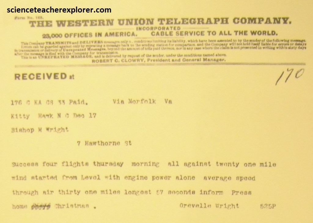 As mentioned, Wilbur and Orville make a total of four flights on December 17th, 1903. They carry the flyer back to camp. In a sudden gust of wind the flyer flips and is damaged beyond repair. Later Wilbur and Orville walk 4 miles (6.44km) to the Kitty Hawk Weather Station and send the above telegram home to their sister about their success. The temperature that day was dry, cold with a wind-chill of less than zero. The wind was a 27 mile-per-hour headwind (43.5km/hr).