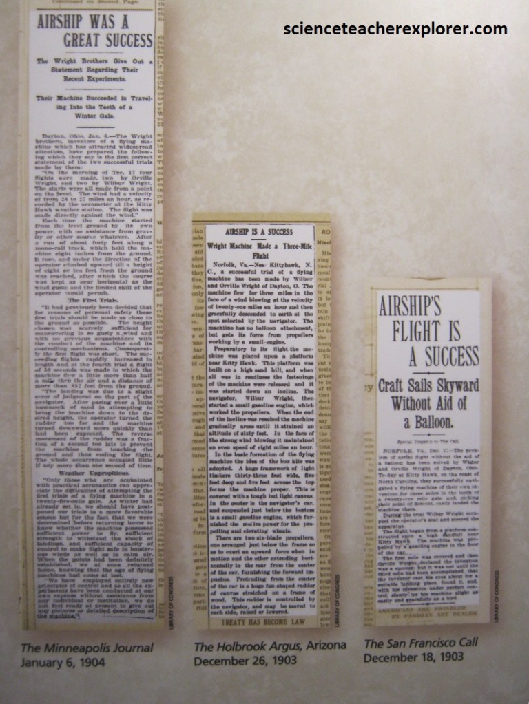 Word about the brothers’ feat quickly reaches the public. But in a world weary of news about flying machines that turn out to be failures, there’s little acclaim. Early newspaper accounts, which exaggerate what happened, don’t help. The “facts” sound so preposterous that readers shrug them off. However the historical summary of the event includes: 1) unrestrained, not tethered to the ground like a kite flight, 2) has the mechanisms to fully determine direction flight, 3) stays in the air for an extended time flight, 4) has a mechanical or electric power source, unlike a glider flight, 5) not buoyant like a balloon flight. [The event made the impossible become possible].