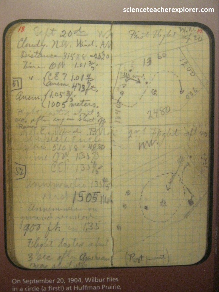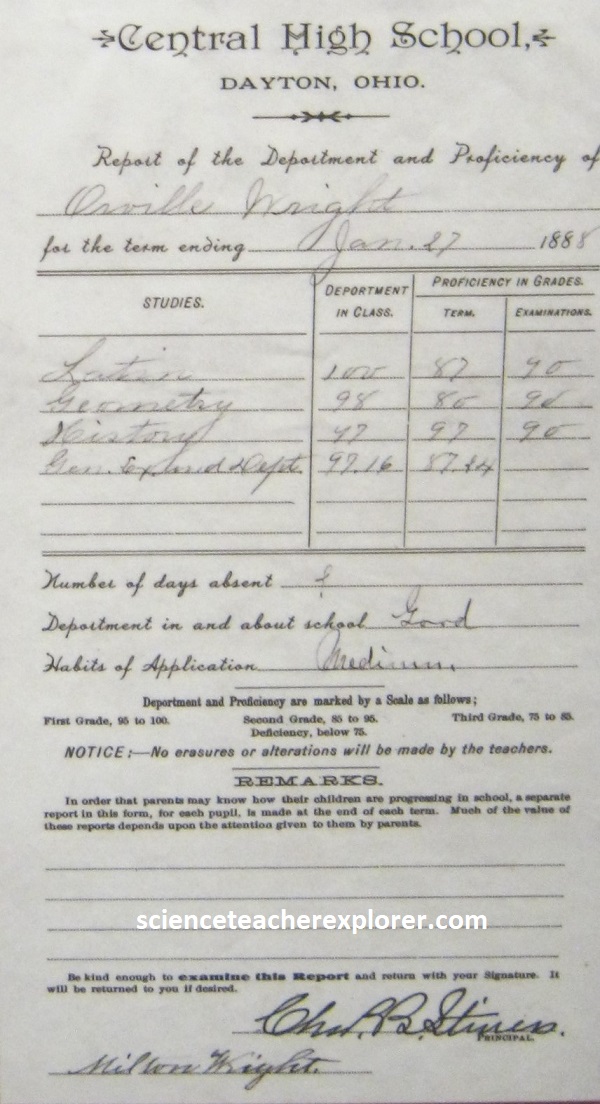 Orville Wright is a dreamer, an idealist, a restless thinker, and a sharp dresser. He’s mechanically minded, (he can see why something doesn’t work, fix it, then make it better). He’s an avid reader, a good cook, and a keen cyclist. Shy in public, Orville’s a prankster and a chatterbox at home. Pictured above, Orville’s report card from Central High School in Dayton in 1888. His teachers gives him a “medium” for his “habits of application”. {The images below were taken from a public interpretive-sign on-site}.