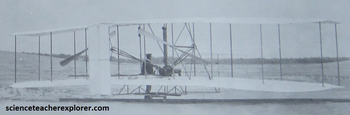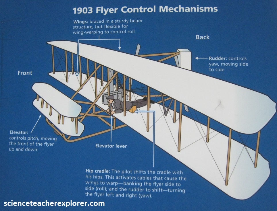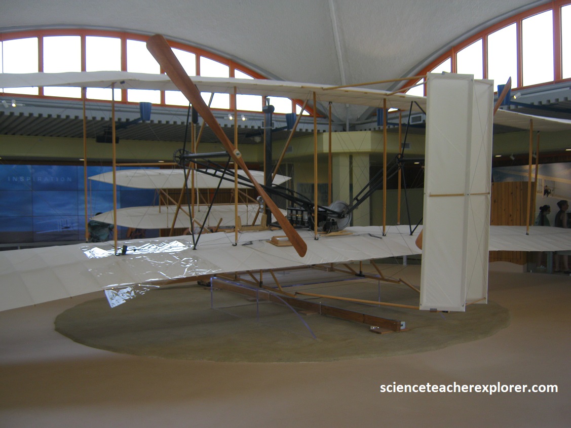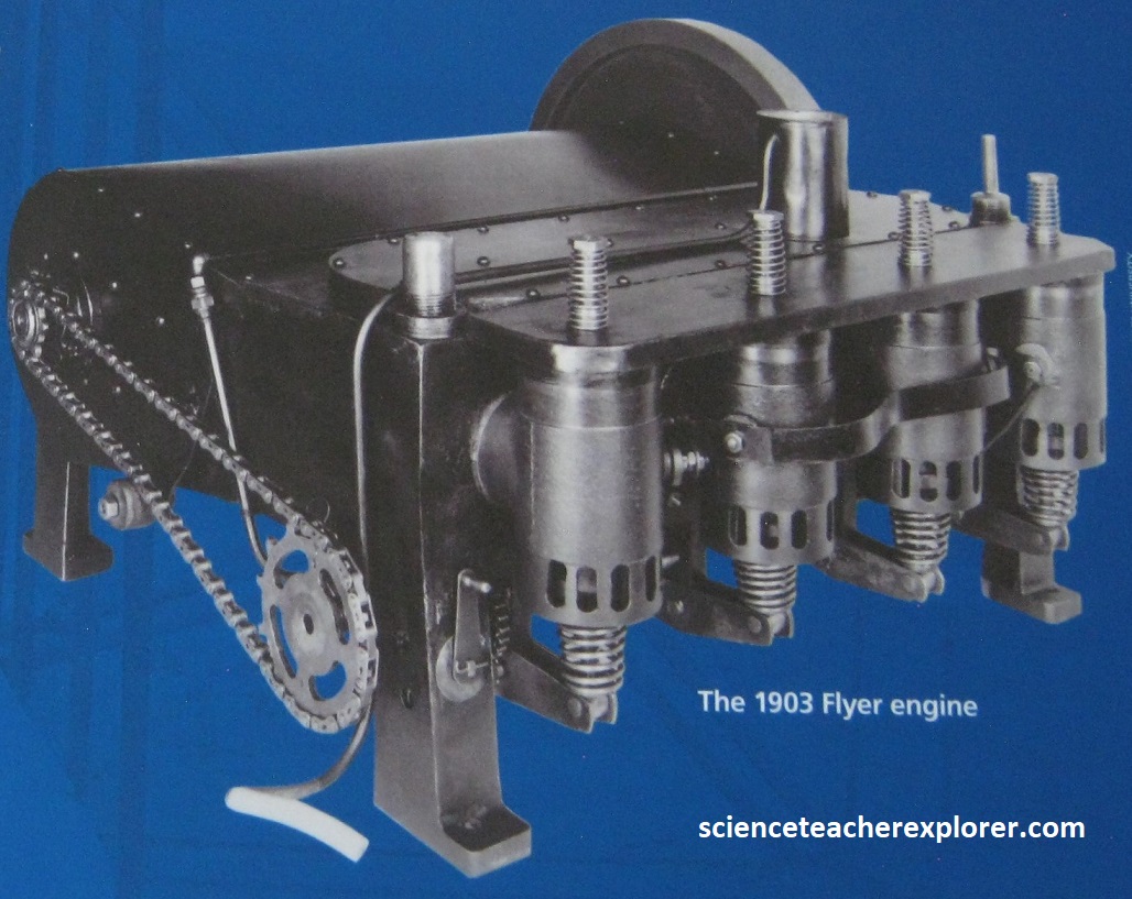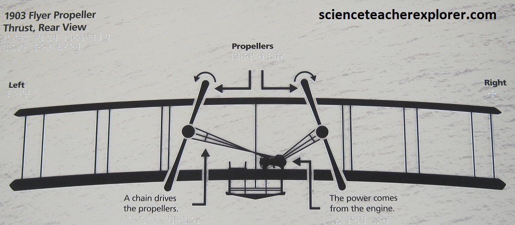 With the 1902 Glider, the brothers knew they had finally solved a way to control the flying machine in the air. In March 1903 they apply for a patent to gain the legal right to keep others from making, using, or selling their system of control. It’s granted on May 22nd, 1906. They also apply for and receive patents from several European nations. Note that the brothers learned that two propellers rotating slowly worked better than one rotating fast. The propellers needed to be designed to give the 1903 Flyer a horizontal thrust. The propellers were just wings that spun in a circle. The tip of the propellers was slightly widened to work best at a low air speed. Since there were two of them, they had to turn in opposite directions to counteract the “Conservation of Angular Momentum” of the spinning blades with each other. (One propeller spinning would cause a torque to the aircraft and make it turn in the opposite direction).