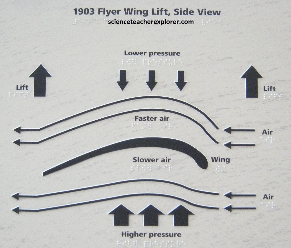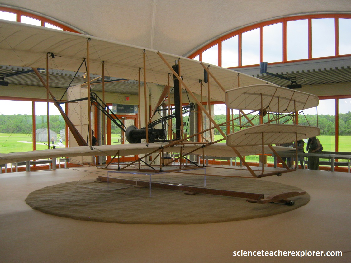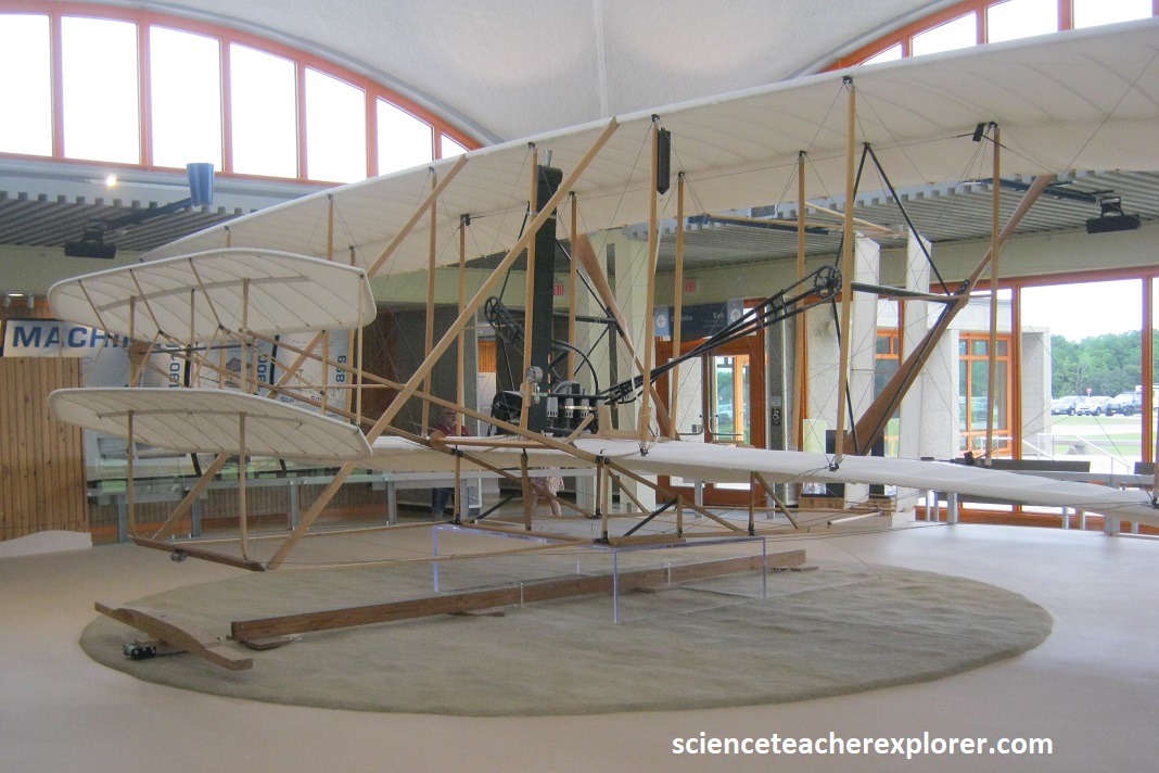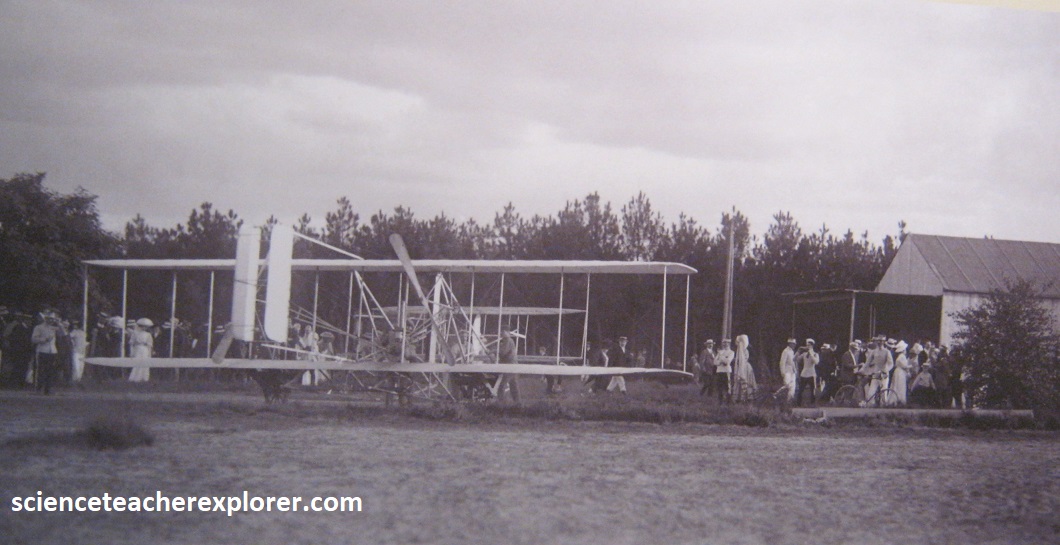 With the 1902 Glider, the brothers knew they had finally solved a way to control the flying machine in the air. In March 1903 they apply for a patent to gain the legal right to keep others from making, using, or selling their system of control. It’s granted on May 22nd, 1906. They also apply for and receive patents from several European nations. Note that the brothers learned that two propellers rotating slowly worked better than one rotating fast. The propellers needed to be designed to give the 1903 Flyer a horizontal thrust. The propellers were just wings that spun in a circle. The tip of the propellers was slightly widened to work best at a low air speed. Since there were two of them, they had to turn in opposite directions to counteract the “Conservation of Angular Momentum” of the spinning blades with each other. (One propeller spinning would cause a torque to the aircraft and make it turn in the opposite direction).