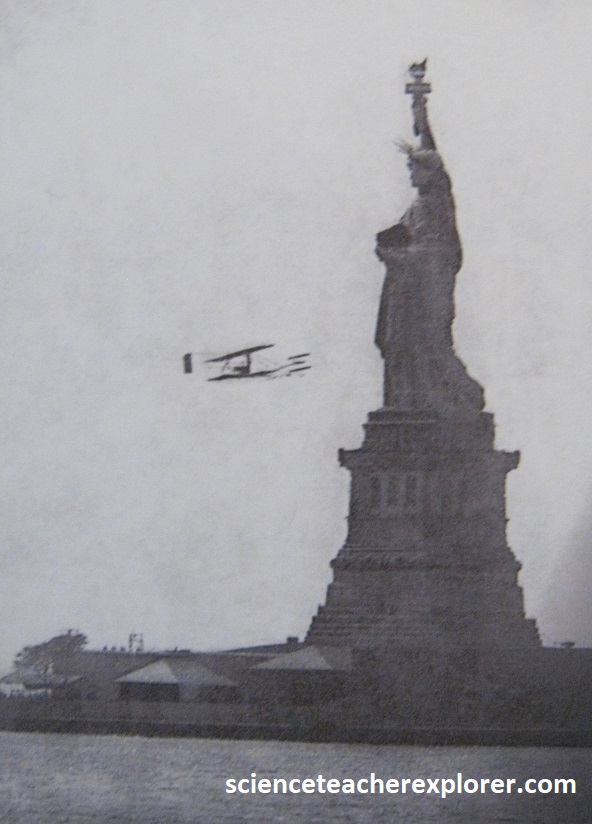 In August 1908, (with the flyer perfected), Wilbur demonstrates it before a huge crowd in Le Mans, France. Overnight, the brothers become global celebrities. In September Orville flies at Fort Myer, Virginia. There, Wilbur circles the Statue of Liberty on September 29th, 1909. He’s strapped a canoe under the plane; if his engine fails, he hopes it will keep him afloat in the water below. Spectators and the press watch and go wild. {The images below were taken from a public interpretive-sign on-site}.