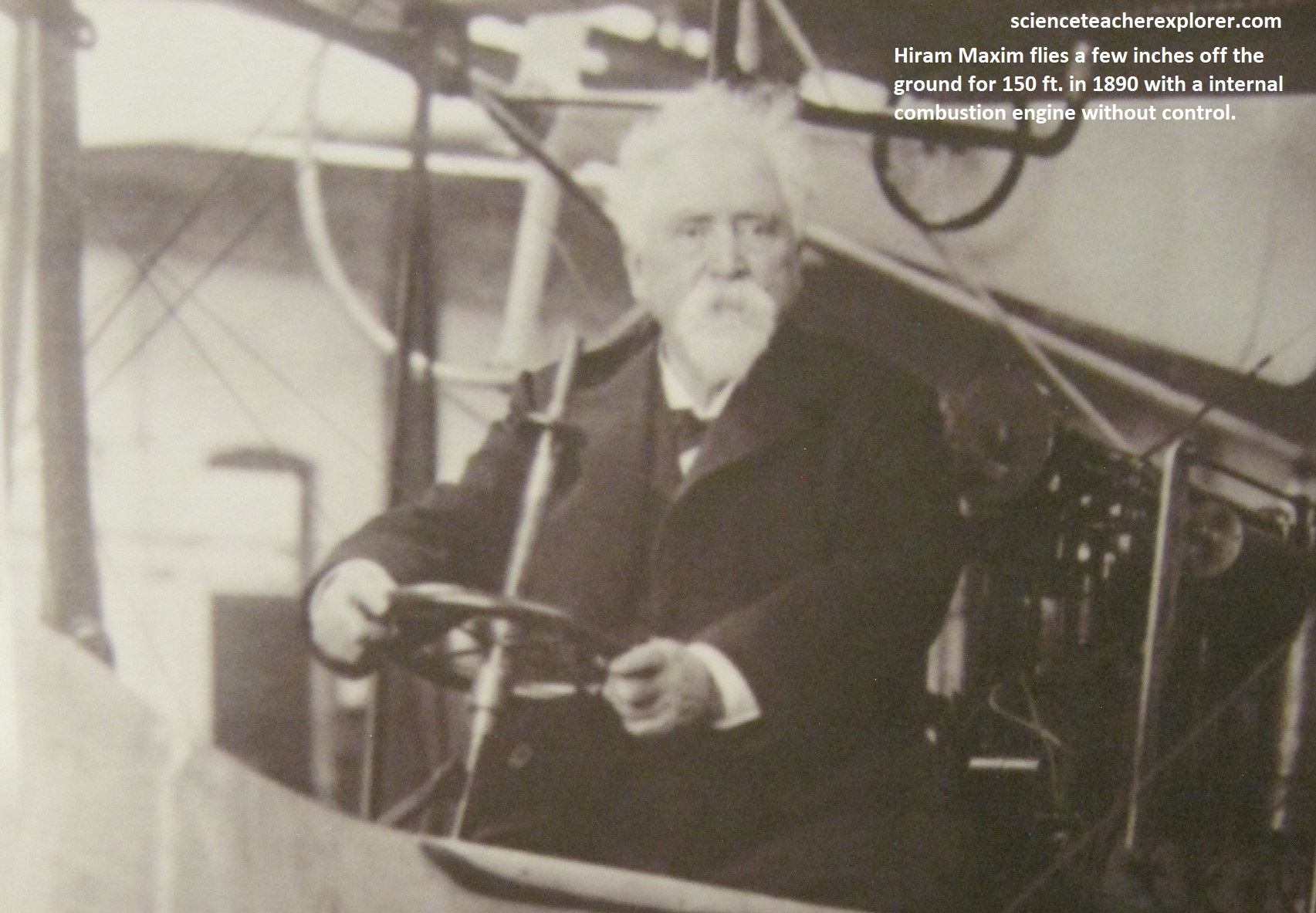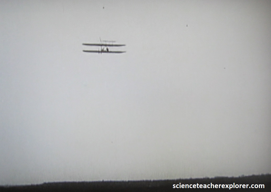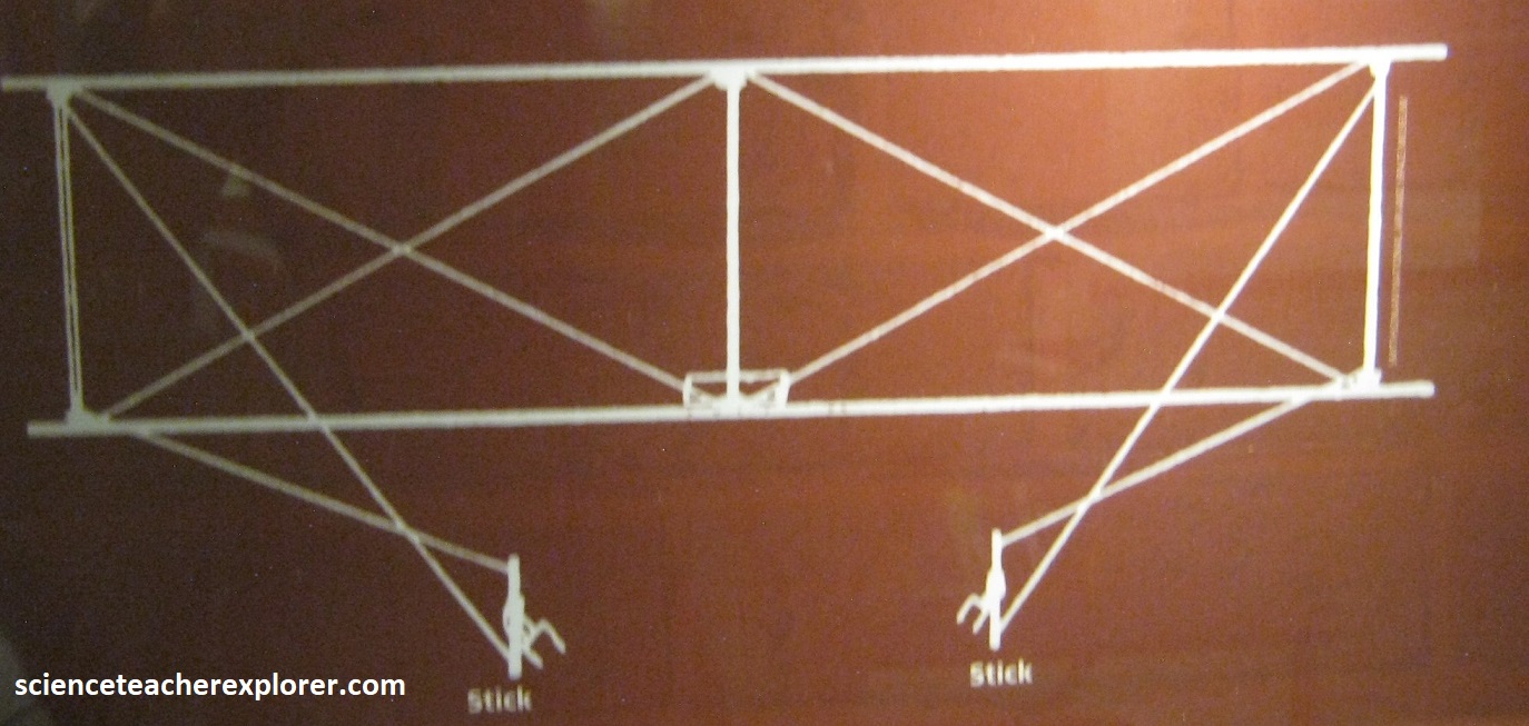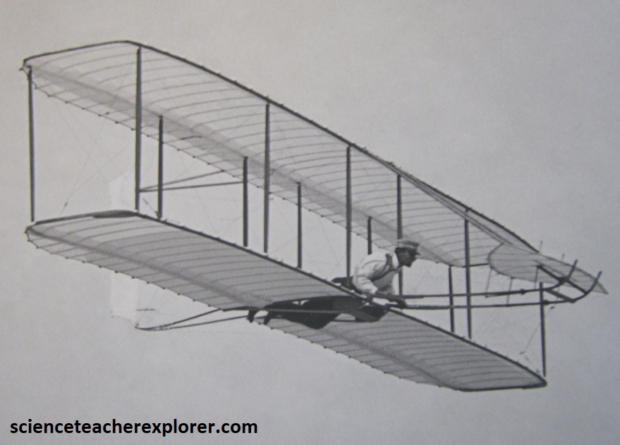 Wilbur and Orville use cutting edge data from their wind tunnel tests to design the 1902 Glider, (pictured above). Once they add a movable rudder to complete the control system, they’ve solved the problems of controlled flight: roll (banking), pitch (moving the nose up or down) and yaw (moving the nose left or right). Note the above photo of Wilbur piloting in the 1902 Glider control system, (with simultaneous use of wing-warping and a movable rear rudder, and a movable elevator in the front).