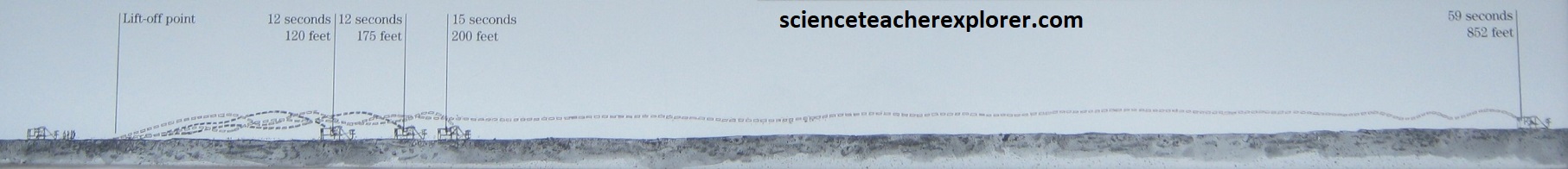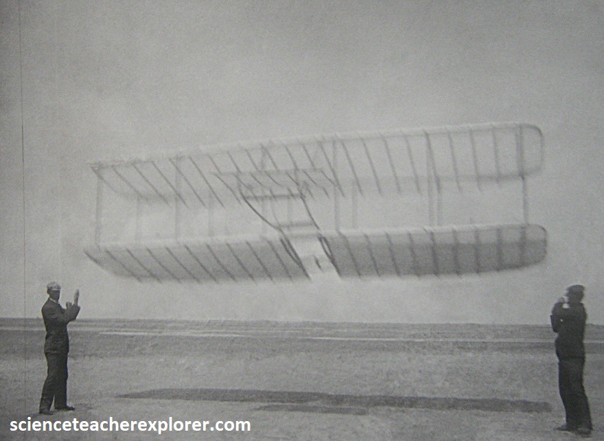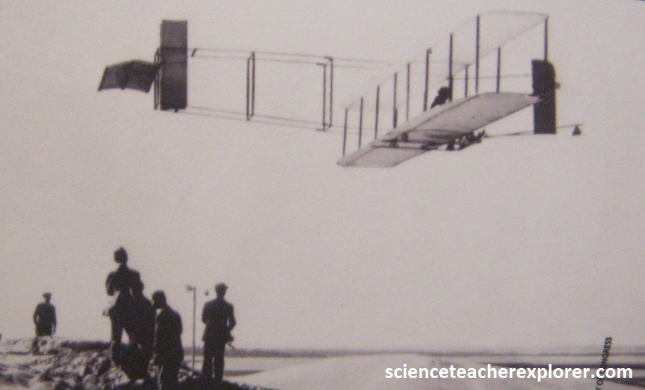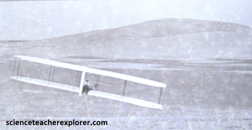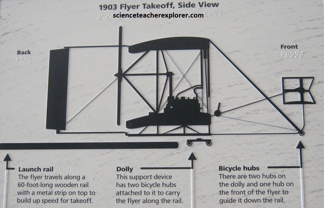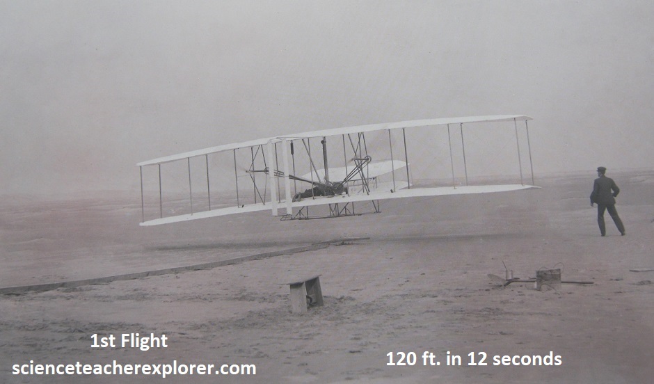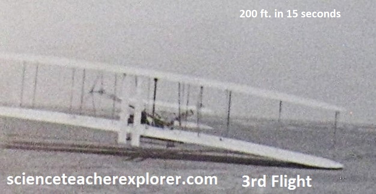 After 4 years of scientific research and rigorous experimentation, and with their 1903 Flyer on the rail, the Wrights were set to fly. In unison, they each pulled down on a propeller. The engine roared to life and the propellers whipped through the air with only a restraining wire to keep the flyer in place. Orville climbed onto the machine and positioned himself into the hip-cradle. He released the restraining wire and the machine slowly moved forward. Wilbur ran alongside to steady the machine. After traveling 40 ft. (13.3m) down the rail, the flyer lifted into the air, ushering in the “Age of Flight”. [Note: The soft sand at Kitty Hawk was not a good “runway”. The brothers built a 60 ft. (30m) wooden rail with metal stripping to provide a hard and smooth surface for takeoff. A dolly of wood and bicycle hubs were placed on the rail to hold the flyer above the sand as it accelerated forward to liftoff].