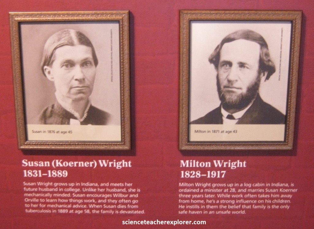 Pictured above, Wilbur and Orville Wright grow up in Dayton, Ohio, in a close-knit family. Parents Susan and Milton Wright foster their children’s curiosity and intellect. And they encouraged them to test their wings and pursue their dreams. {The images below were taken from a public interpretive-sign on-site}.