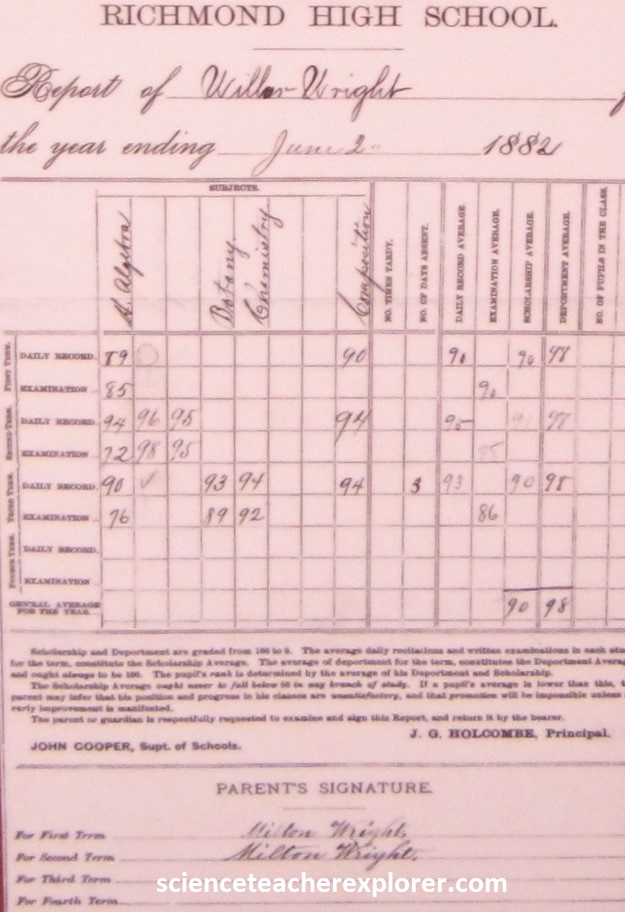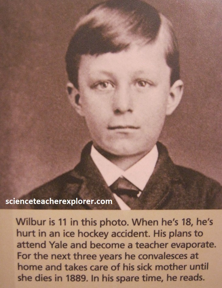 Wilbur Wright is smart, well-spoken, quick-witted, able to retain facts and put things in a logical order, an athlete (gymnastics and cycling), and a natural leader. He’s also shy, calm, quiet, and a little rumply. Pictured above, is his report card from Richmond High School in Indiana, 1882. He completes high school in 1884, but the family moves to Dayton before he receives his diploma. {The images below were taken from a public interpretive-sign on-site}.