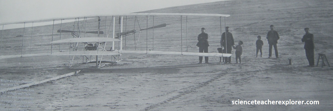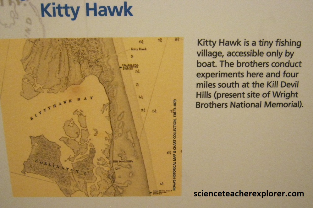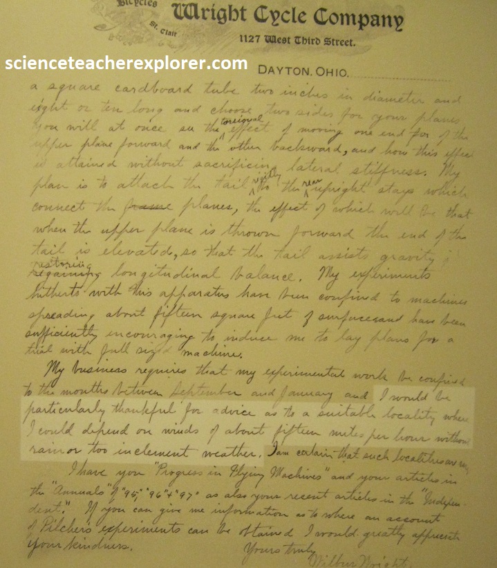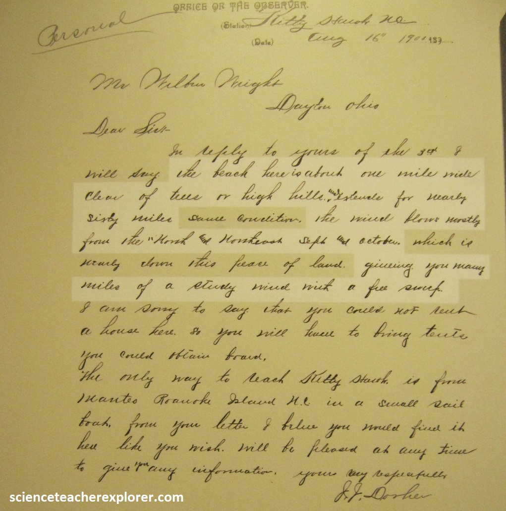 From their studies, Wilbur and Orville learn that they will need three things for a successful flying machine: (1) wings for lift, (2) an engine for power, (3) a control system to balance and steer. They tackle the hardest part first: control. They make a connection between flying and cycling: it’s about turning. To stay in control while turning a bicycle, you have to lean your body to stay balanced. The brothers think they can apply this same concept to help control a flying machine. It was in 1899, when Wilbur is idly twisting a bicycle inner tube box when he sees the answer: a biplane with flexible wings could raise one wing and lower the other, (twisting and balancing in the air like a bird). They immediately made a prototype model kite in their shop. Wilbur flies the kite in a nearby field, and it works, (it balances, twists, and turns with ease). They call this mechanical twisting “wing-warping”. Their success will spark years of experiments with kites and gliders. AS their design progressed, the brothers wrote the U.S. Weather Bureau for help finding the best place to build and test their invention. The wind-blown village of Kitty Hawk was selected for having steady winds, soft sands, wide-open terrain, and a sparse population (to deter onlookers). Below are hand written letters of Wilbur asking permission to move his experiments to Kitty Hawk. The Wright brothers began testing kits and gliders from the top of the dunes, refining their approach with each attempt. {The images below were taken from a public interpretive-sign on-site}.