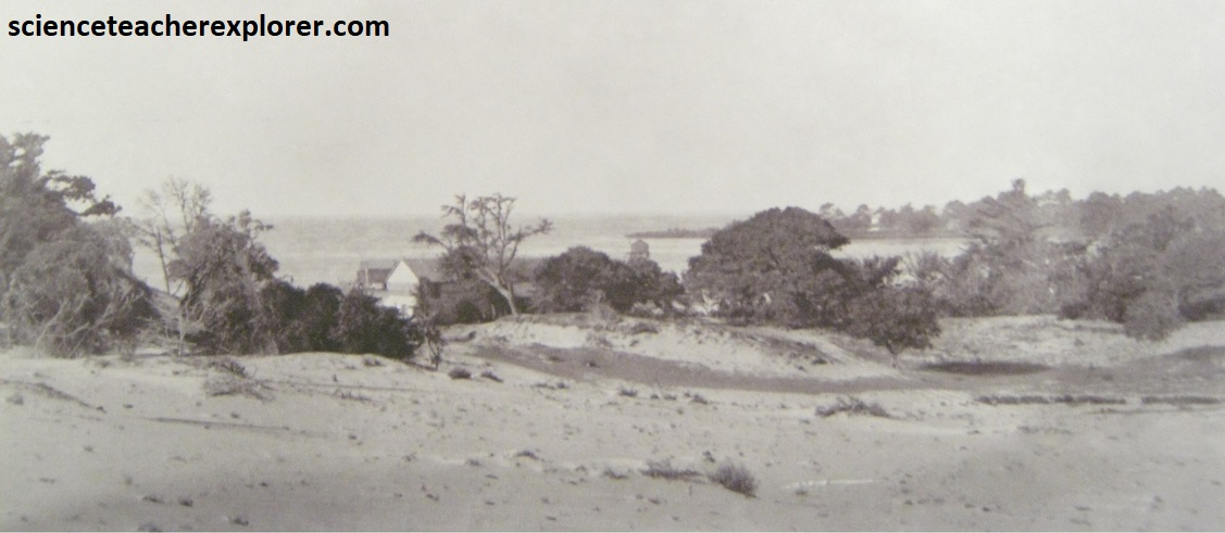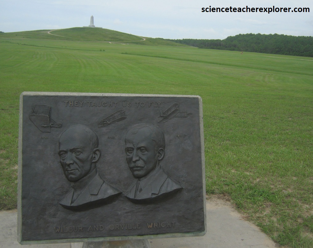 When the Wright brothers were at Kitty Hawk, Big Kill Devil Hill, (the hill pictured above), was a massive sand dune. Thousands of times, the brothers trekked up this and three nearby dunes to conduct glider experiments. Climbing the hill at that time was strenuous. Deep, soft sand caused every step up the slope to slip part-way back down. The Wrights were also burdened with carrying their heavy gliders up the hell for each flight. Their tireless efforts paid off as they mastered their flying skills and refined their flight controls. [Note that the historical-image above was taken from a public interpretive-sign on-site}.
