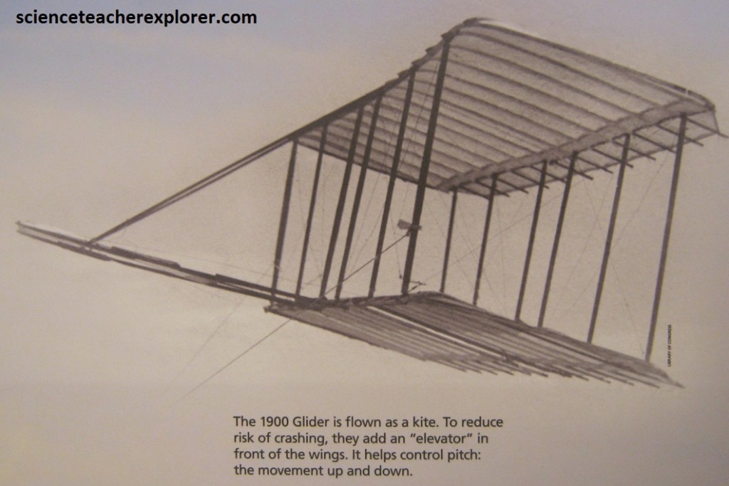 Wilbur and Orville return to Kitty Hawk in the summer of 1901, (pictured above). {Note that the images above were taken from a public interpretive-sign on-site}. Their experiments don’t go well. The glider, still based on Lilienthal’s data, is bigger than last year’s but not better, (serious problems with lift again). While they make their lonest glides yet, they face problems with the control system. Wing-warping often causes the glider to spin into the ground. {The images below were taken from a public interpretive-sign on-site}.