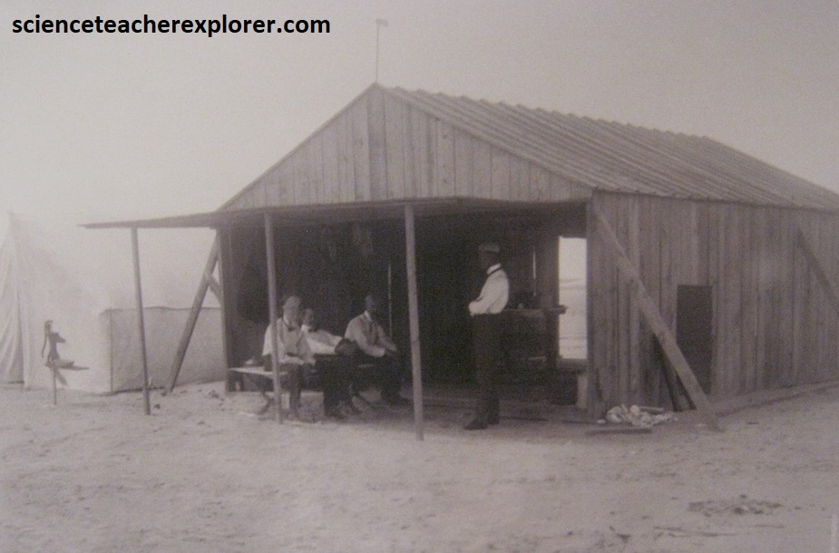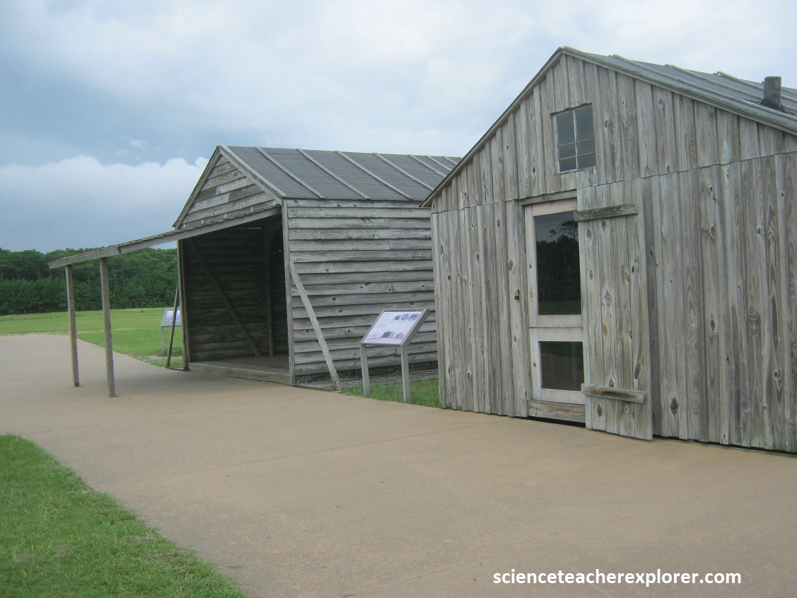 Wilbur and Orville Wright lived and worked in the area that was north of Kill Devil Hill (near the constructed rail) during their 1901, 1902 and 1903 testing seasons, late summer through autumn. Pictured above are the reconstructed buildings that depict the Wright brothers’ 1903 camp. Each year, the brothers refined their camp. In 1901, they built a wooden hanger/workshop (right building) for their glider and lived in a tent. They eventually moved their living quarters into the hangar/workshop building in 1902. In 1903, needing more space for their flyer, the brothers built a large hangar, (left building).