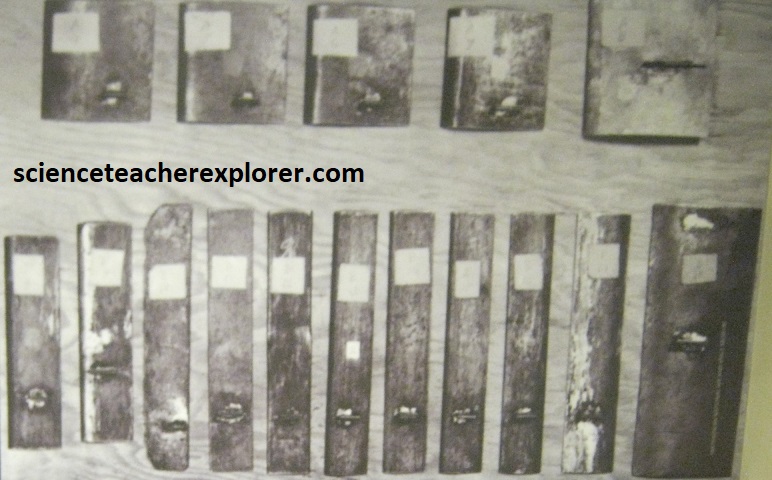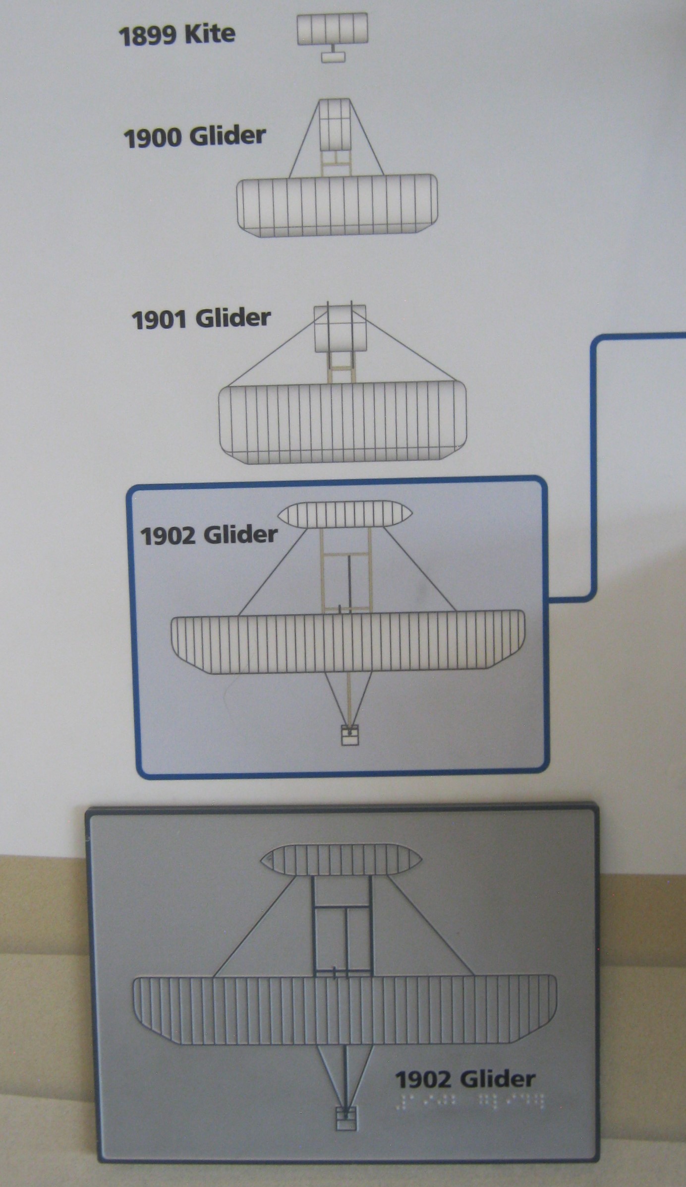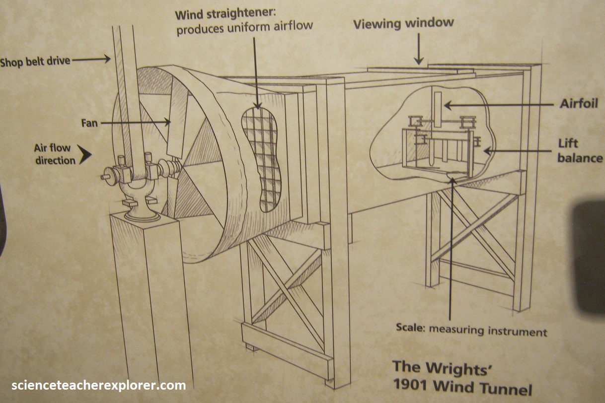 Pictured above, from their bicycle shop in downtown Dayton the brothers began researching, (they believe the answer to control may lie in the way birds fly by twisting their wings ever slightly to keep control in air currents), and experimenting with flight mechanics using their homemade wind-generator (pictured above) to calculate their own lift and drag for flight. [They create a 30 mph wind flow with a fan and measure the effects of lift and drag on the airfoils]. Using measurements from their experiments and tests, the brothers calculate a new average coefficient value of 0.0033. This is instrumental in their success. They now have the most accurate data in existence. After testing dozens of airfoils, (small wing shapes pictured above) in their wind tunnel, the brothers find that #12 has just the right curve and shape to make a glider stable and easy to control. They then build a kite-like glider, in 1899, for testing in the wind. {The images below were taken from a public interpretive-sign on-site}.