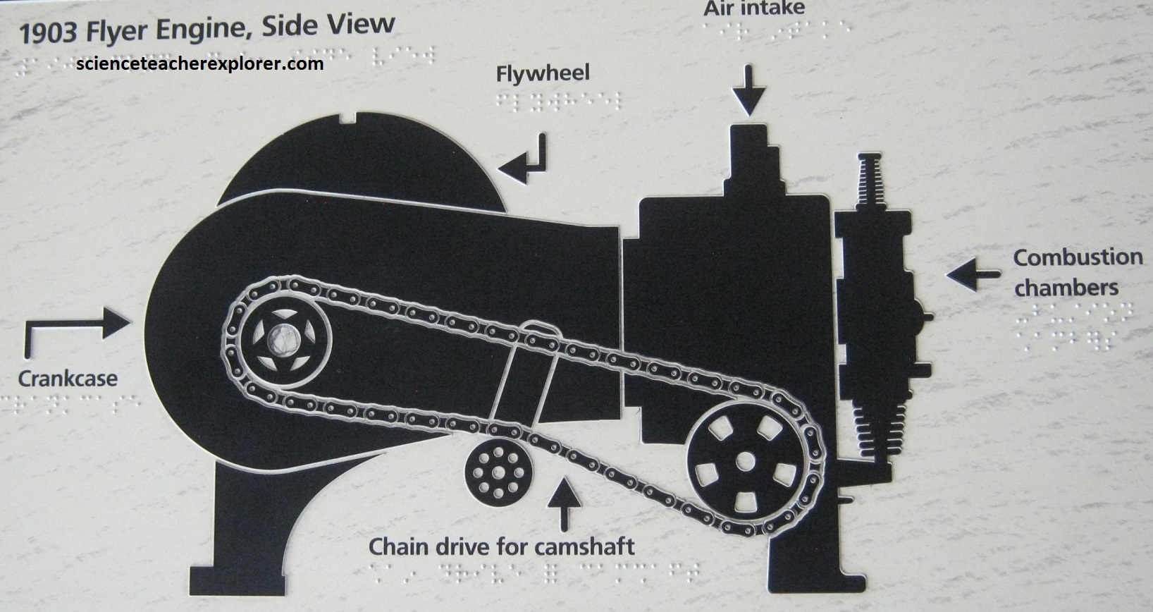 Pictured above, the Wright brothers engine they used was to produce the power for moving the propellers and giving the flying machine thrust. In calculating the performance of the propellers, the brothers knew their engine had the power to get them into the air. Lightweight, their engine is unlike any ever built. It had 4 cylinders, 12 horsepower at 1200 rpms (350 rpm propeller speed), 170 lbs. weight, and a 201 cubic inches of piston displacement. [Note: the flyer’s engine broke into pieces after the brothers’ 4th flight in 1903, the crankcase survived and was cast out of aluminum alloy]. {The images below were taken from a public interpretive-sign on-site}.
