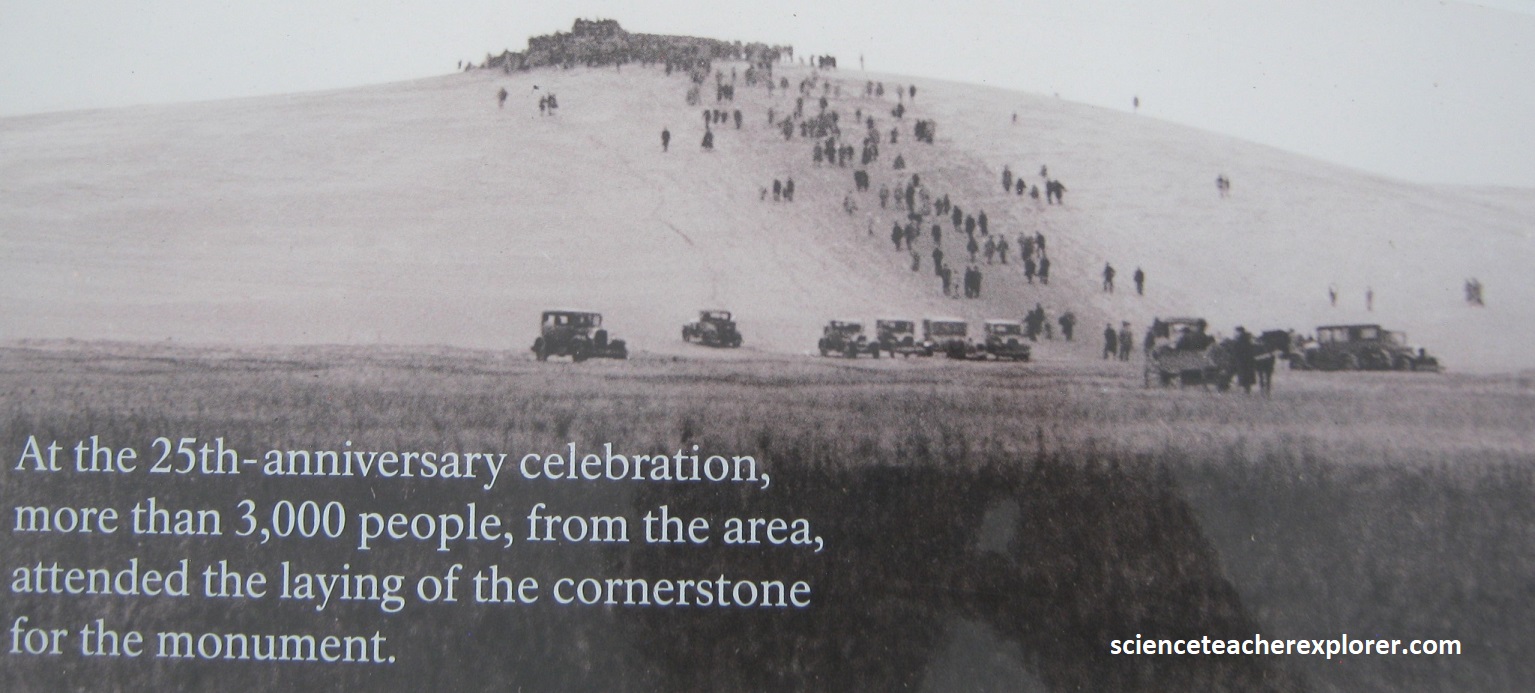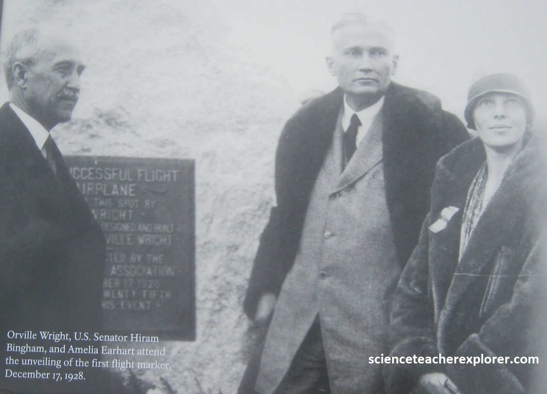 The Kill Devil Hills Memorial Association, later to become the First Flight Society, too the lead in organizing 25th-anniversary celebration held in 1928. The event featured the unveiling of the first flight marker and the laying of the cornerstone for the monument. Orville Wright, Amelia Earhart, and more than 3,000 people from the area participated in the event. {The images below were taken from a public interpretive-sign on-site}.