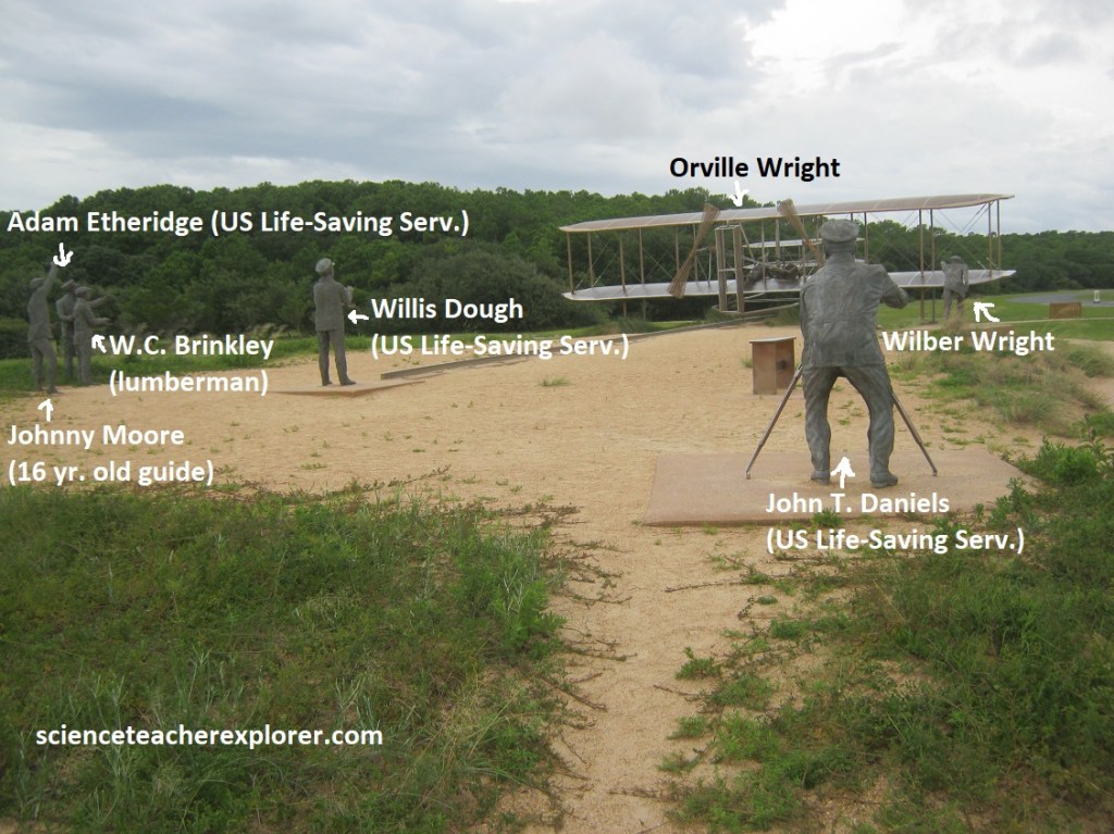 On the morning of December 17, 1903, the Wrights signaled for help and “John T. Daniels, W.S. Dough, A.D. Etheridge, W.C. Brinkley of Manteo, and Johnny Moore of nearby Nags Head arrived. With their help the Flyer was moved to the launch rail. The men then cheered as the Flyer lifted off the ground.