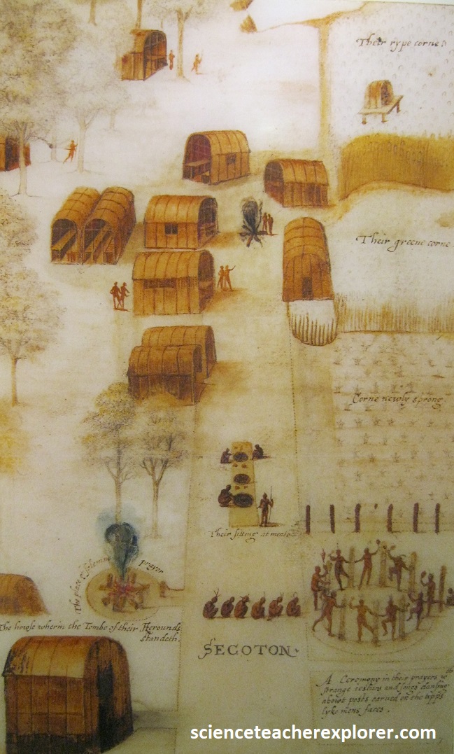 Pictured above, is of Thomas Harriot. He is credited to be the scientist whom first explored the scientific concepts of refractive optics, the structures of the Moon, binary mathematics and the navigational techniques to cross the Atlantic to the New World. He made several exploratory trips to the New World. However, his importance to the Roanoke colony and the broader English colonization effort stemmed from his detailed documentation and promotion of this region. His work, particularly of his publication called “A Briefe and True Report of the New Found Land of Virginia,” provided valuable information about the land’s resources and the local Native Americans, encouraging both investment and settlement back in England. Harriot learned some of the local Algonquian language and served as a translator and liaison with the indigenous people, building trust and gathering valuable knowledge of the area. I found this guy as a fascinating historical character in the Roanoke Island story.