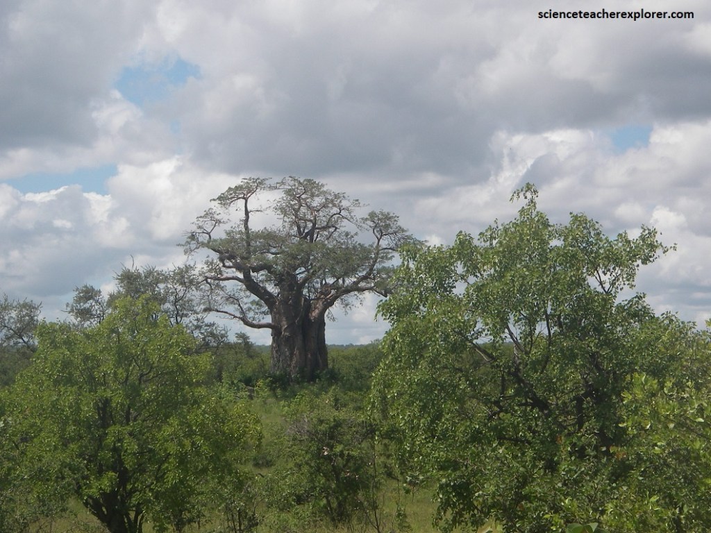 Pictured above, the Baobab Adansonia digitata is a large tree with a hugely swollen, barrel-shaped trunk. A noticeable characteristic of the Baobab is its bark, which often appears in smoot folds. The leaves appear glossy, with 3-9 leaflets in mature plants. The flowers are large, pendulous and white. The fruit is oval in shape, about 120 mm long, with a hard woody shell. The Baobab tree stands tall here in Kruger National Park. The colossal form of these trees goes hand-in-hand with their usefulness, as they provide shelter shade, water, food and shelter for a wide variety of animal species. It is thought that Baobabs may be the oldest life forms on the continent, with carbon dating calculating that some found are as old as 3000 years.