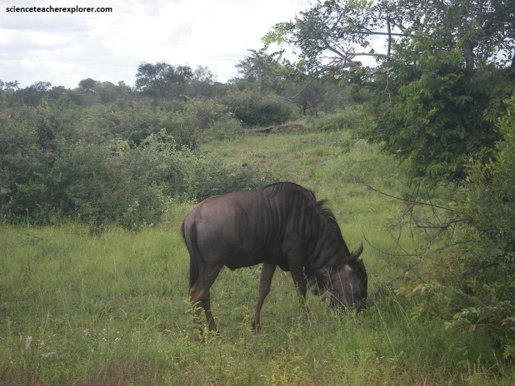Pictured above, we immediately saw this Blue Wildebeest Connochaetes taurinus. It is a blue-grey cattle-like animal with dark vertical stripes on the neck and flanks. This one had a black face, mane and tail. Both sexes have horns, but the males are larger.