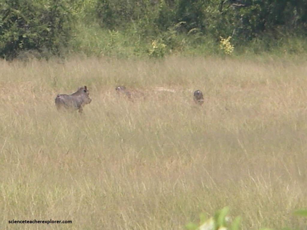 Pictured above, near the Kudu were a small family of Warthogs Phacochoerus africanus. They were grey with little body hair. The male had longer canine teeth. I noticed that their tails were held-up while running away.