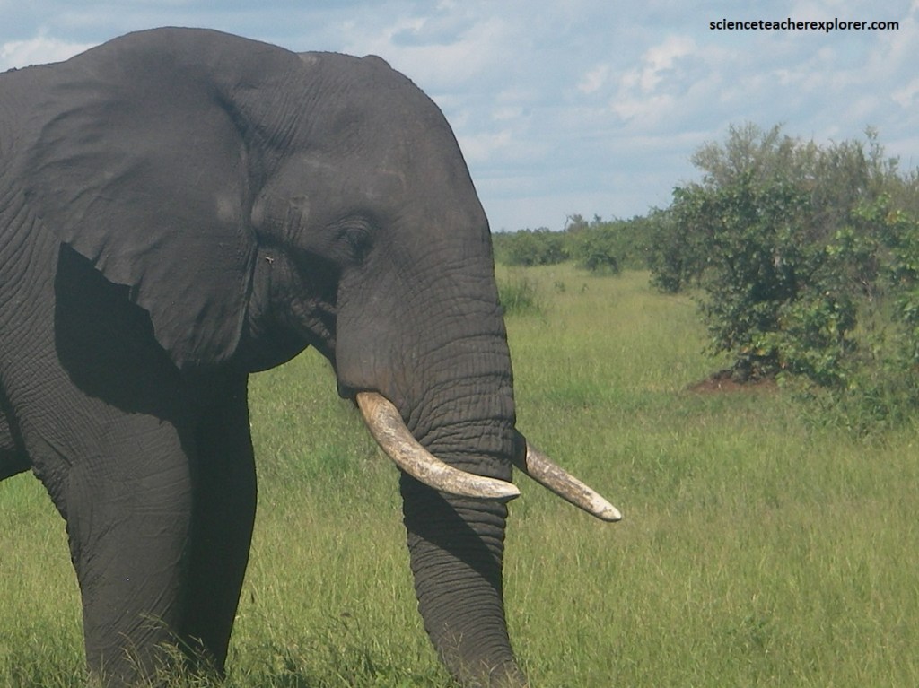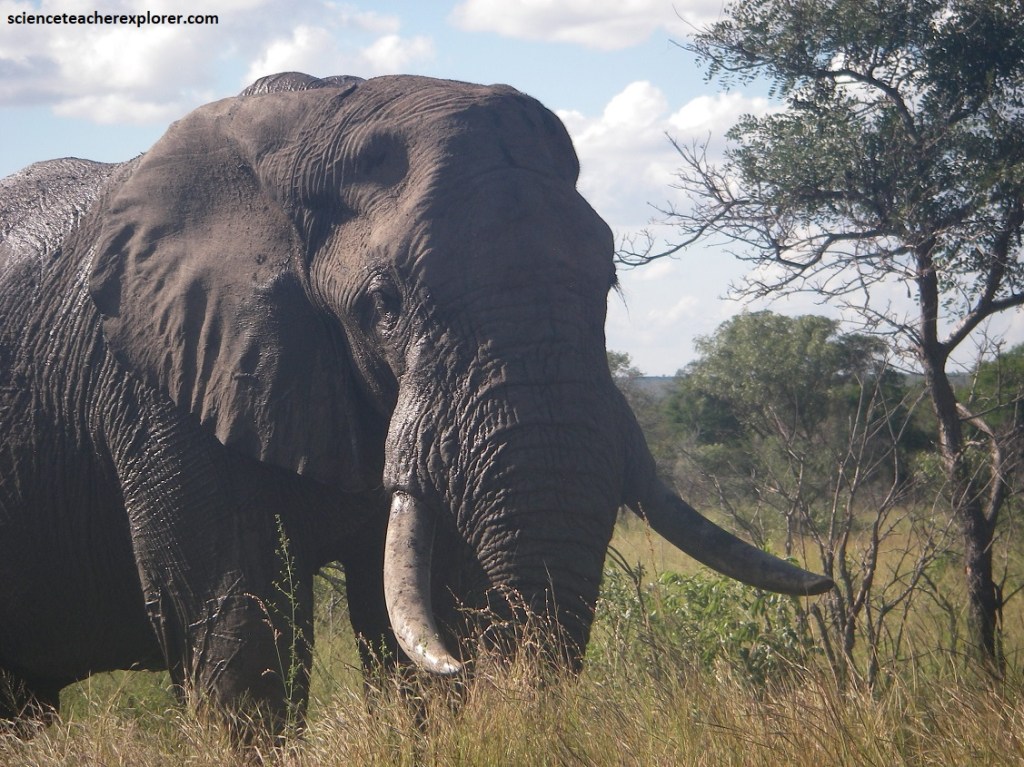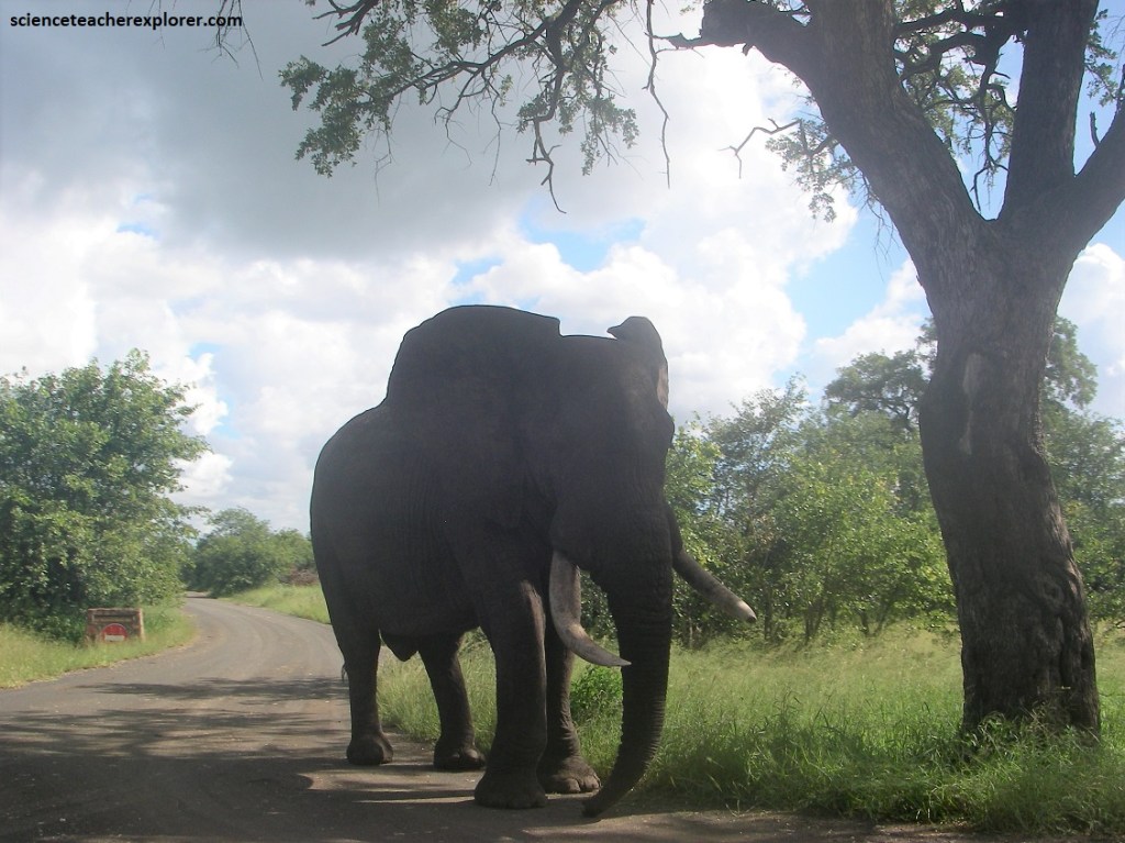 Pictured above, this African Elephant Loxodanta africana was a gigantic animal with large ears, long legs, prominent tusks and a versatile trunk. This one seemed to be a solitary bull.