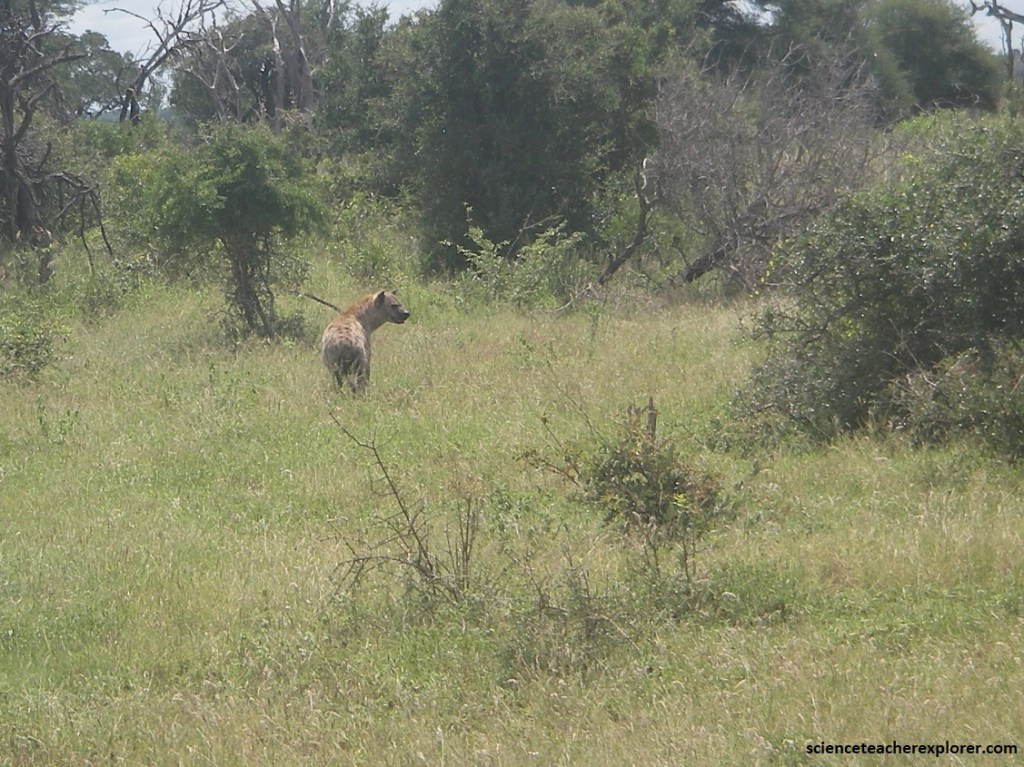 Pictured above, we saw a Spotted Hyaena Crocuta crocuta leaving a den of Wild Dogs near the H7 road. It was distinguished from the less common Brown Hyaena with dark spots. What it was doing in a den of Wild Dogs is unknown, but their known to be efficient scavengers. Hyaena clans are strongly territorial and show evidence of a robust female-dominated hierarchy. In this Central Region they do not attack large mammals, as is the case in East Africa, and are able to survive adequately by preying on small animals and scavenging the remains of lion or wild dog kills.