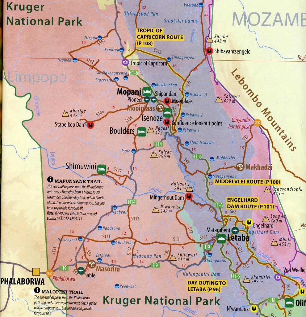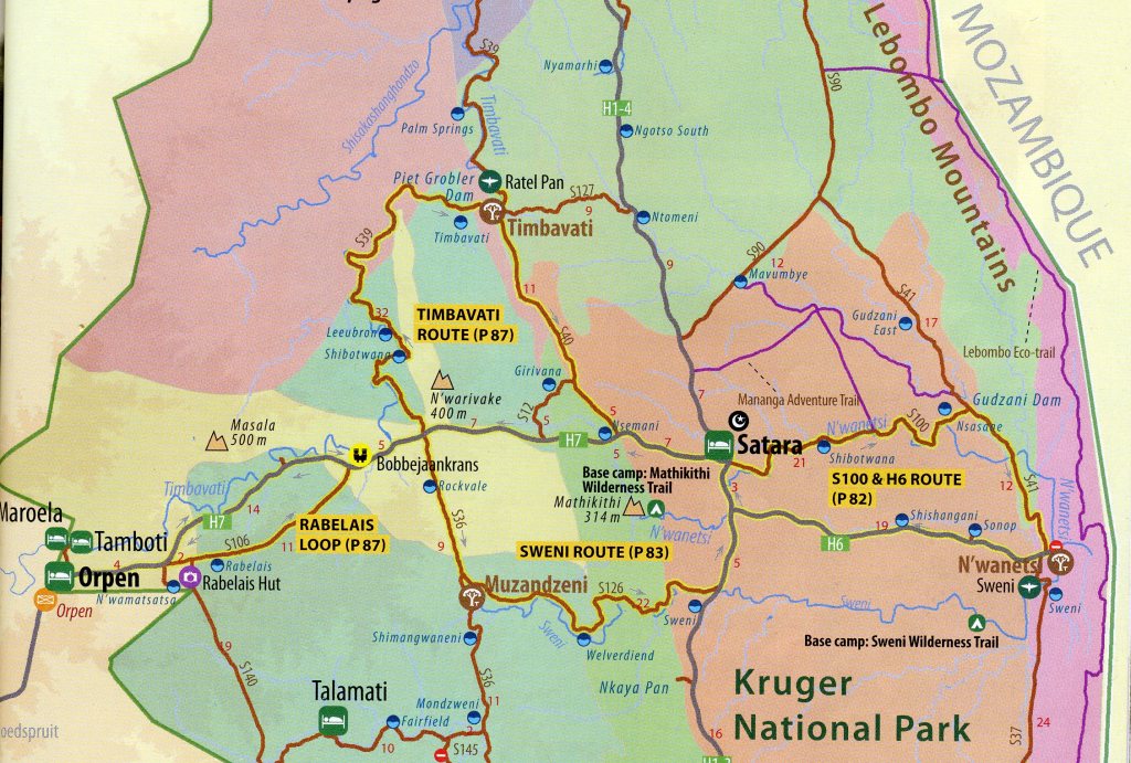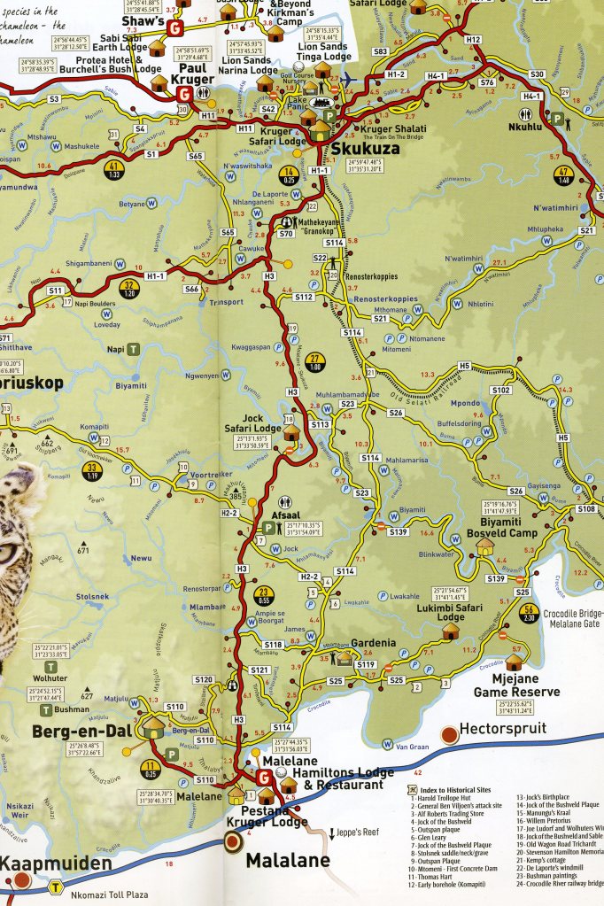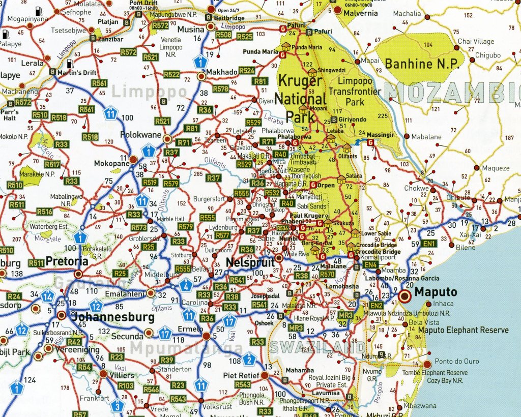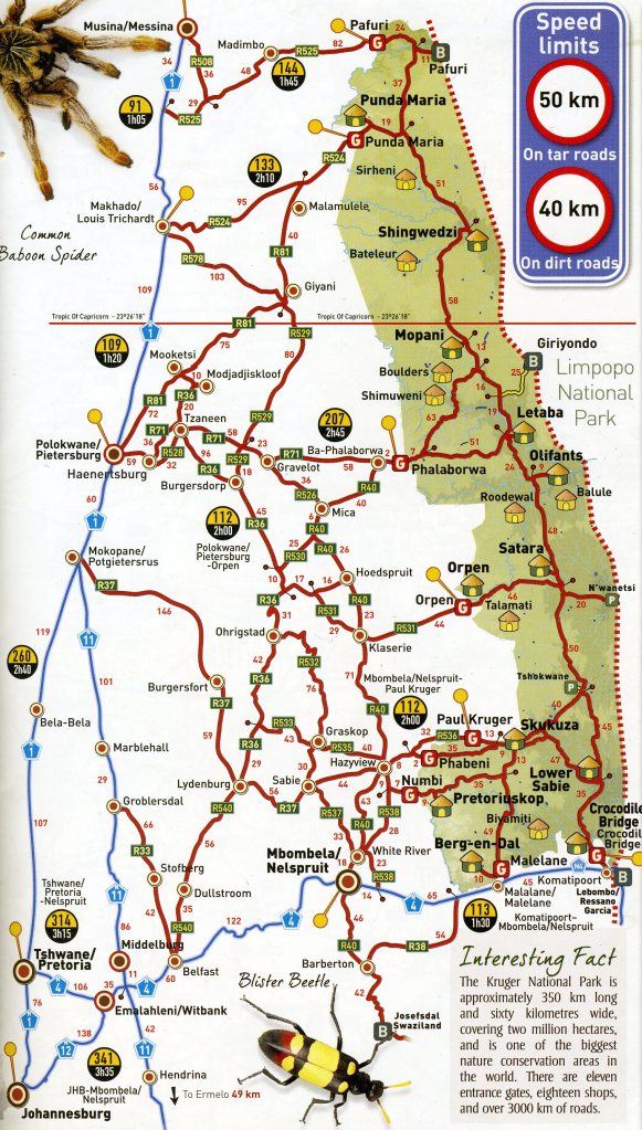 Kruger National Park has 9 different gates-of-entry from South Africa, (2 more are from Mozambique). All of the gates are a 5- to 6-hour drive from Johannesburg or Pretoria. My trekking buddies, (the Mike Stevens family), and I, had decided to start our exploration of the park at the northern Punda Maria Gate (581 km from Johannesburg). The remaining gates that we entered in the next three days were, consecutively, Phalaborwa, Orpen and Malelane. We chose to stay the nights within the small cities of Tzaneen & Nelspruit.