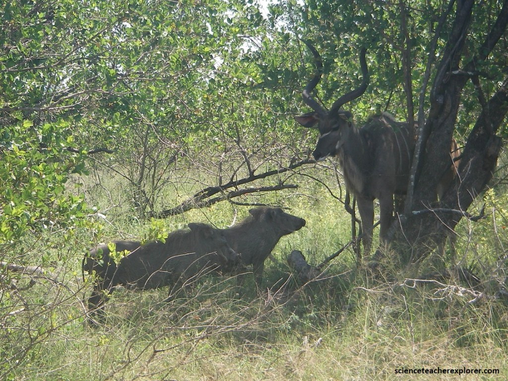 Further north on H3, we found a Kudu Tragelaphus strepsiceros. This was a large, elegant antelope with white stripes on his body. He had rounded ears and impressive, spiral-shaped horns. I’ve heard that Kudus were renowned jumpers that were capable of jumping as high as 2m. The Bushpigs’ Potamochoerus larvatus bodies were cover with long brownish hair with a lighter mane. I’ve been told that they are aggressive when threatened or cornered.