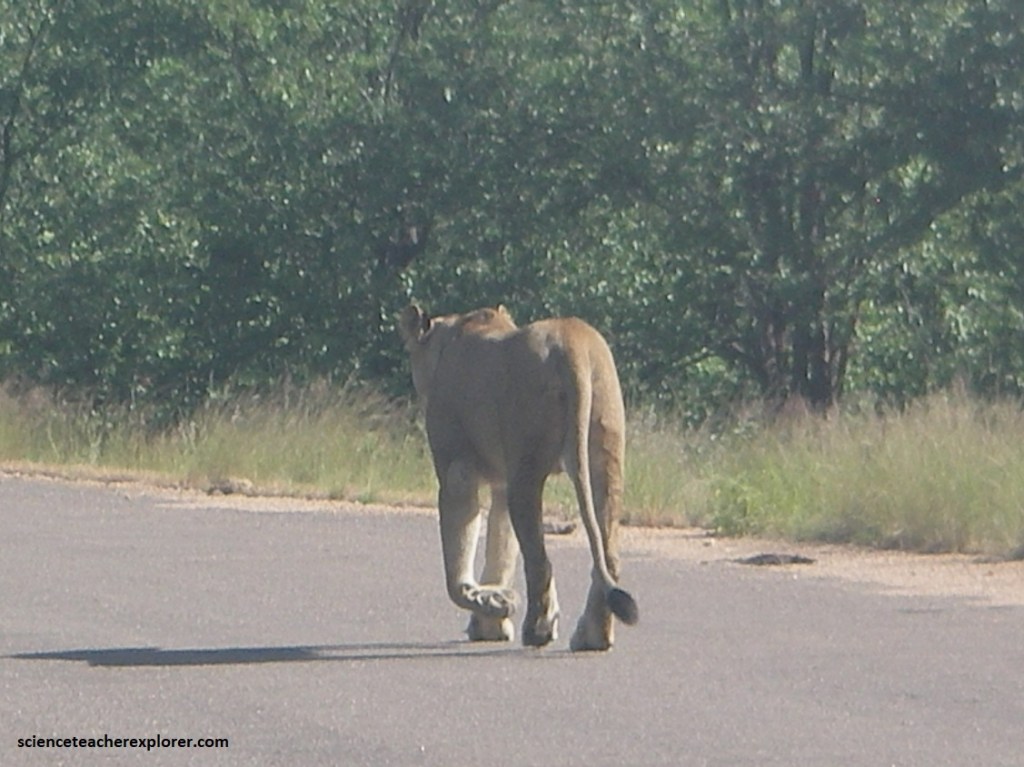 Pictured above, a Lion Panthera leo was walking on the road of H1-6 towards Letaba while we were returning back towards the Phalaborwa gate. The largest cat in the park and the only one to live in prides. This female lion is usually nocturnal, but walking around in the day does happen. The huntresses prefer larger prey such as impalas or blue wildebeests.
