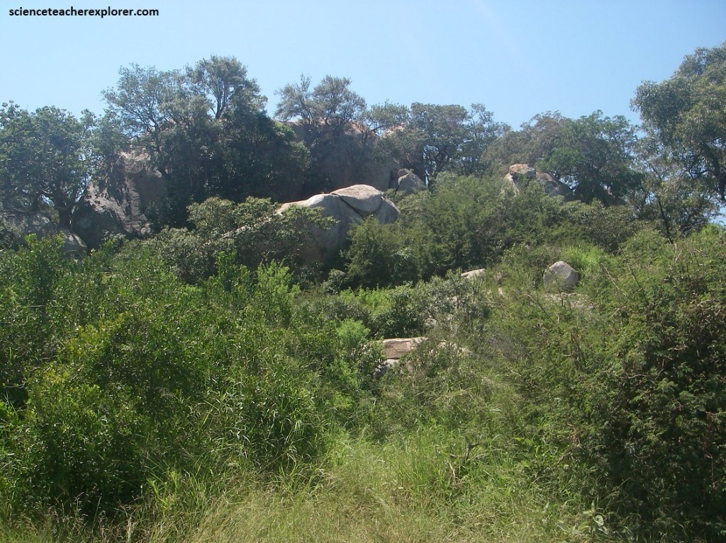 Pictured above, some of the hills are small bare rock domes, while many more have rock slopes that are more or less covered with woodland. The locals call these domes, “granite koppies”.