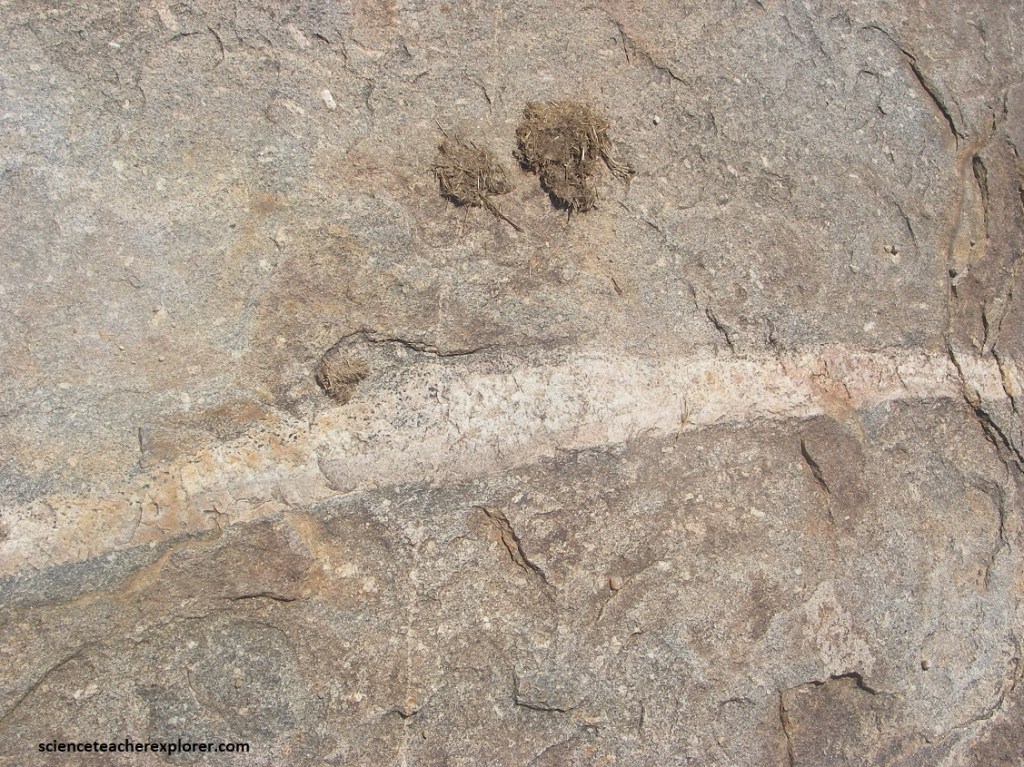 Pictured above, The rock exposed on Mathekenyane is a grey granitic gneiss cut by paler granite veins, interpreted as produced by partial melting of the hot gneiss complex during migmatisation. The above image shows how these veins vary greatly in their texture and mineral content: most of the veins are pink with relatively small crystals, although in places there are patches of coarse crystals of translucent grey quartz and pale feldspar (“pegmatite”: lower right), and areas rich in black biotite-mica. Note the large, rectangular crystals of white feldspar in the grey gneiss, giving it a porphyritic texture. Feldspar, like most minerals that form rocks on Earth, is a silicate, as well as being the commonest mineral in the Earth’s crust.
