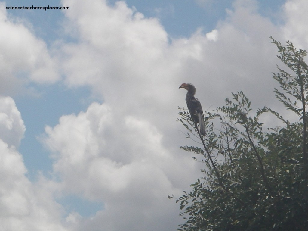 Pictured above, in a Sweet thorn tree on H7, we saw this Yellow-billed Hornbill Tockus leucomelas. Obviously, the bill was yellow along with the its eyes. It’s facial skin seemed to be redish pink. The upperparts were black with stripes and spots.