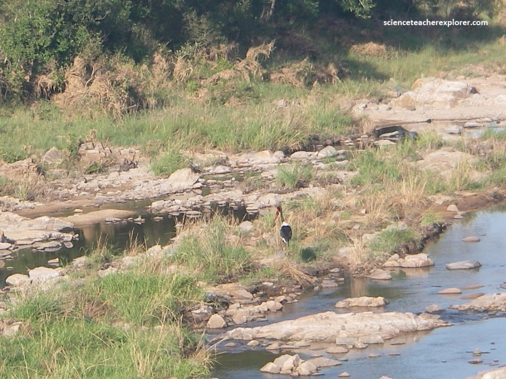 Pictured above, the Saddle-billed Stork Ephippiorhynchus senegalensis on the Mlambane River is a very large black and white stork. The yellow saddle at the base of the large black and red bill, is characteristic.