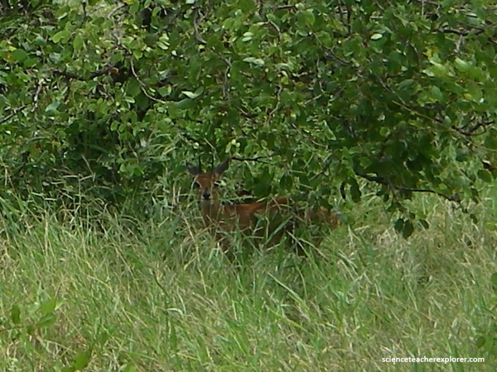 Pictured above, the Steenbok Raphicerus campestris has orange-brown with white under-parts and large ears. The inside of the ears is white with dark stripes. This is a solitary male because it has horns.