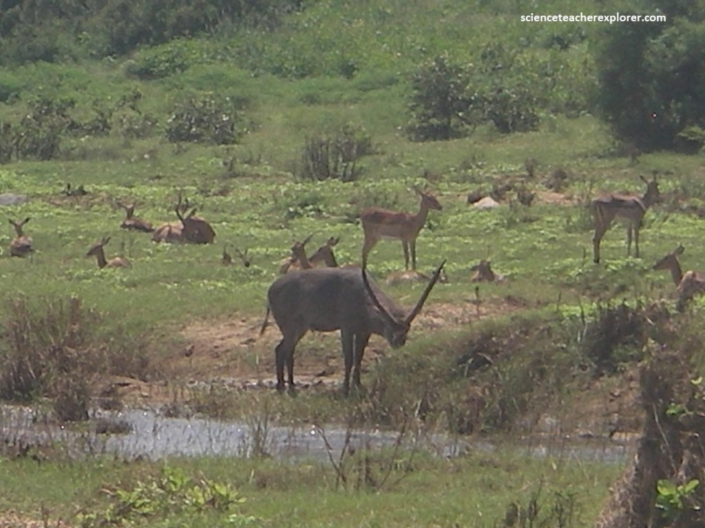 Pictured above, a large antelope Water-buck Kobus ellipsiprymnus is seen along the Letaba River bank with long greyish brown hair. The white collar under the throat and white circle around the tail was characteristic of the Water-buck. This male had forward curving horns and was larger than the females seen nearby. However, the animals in the background of the photograph above are Impalas.